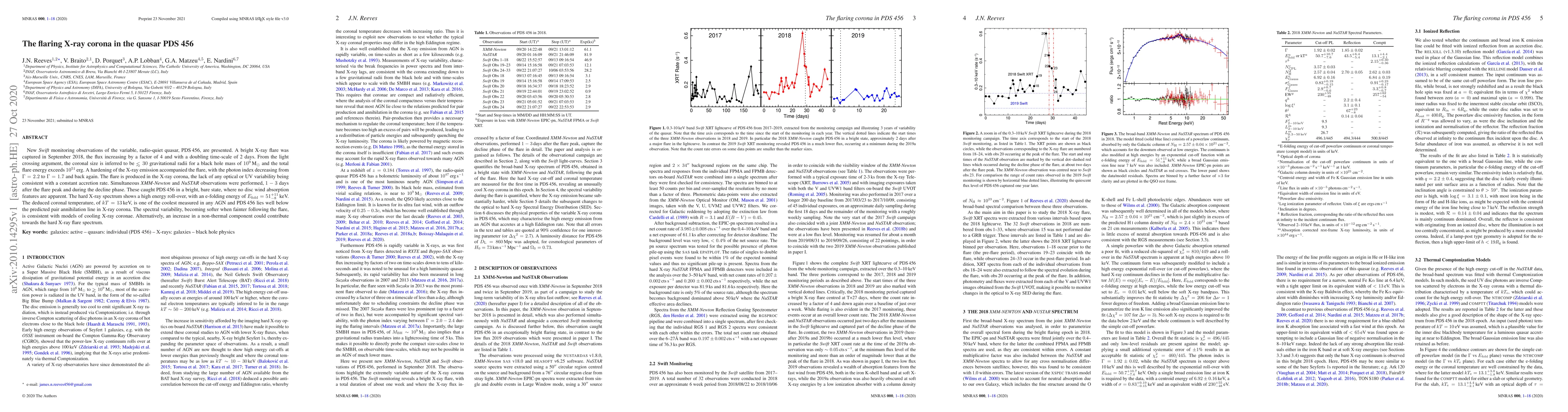 The research observes a significant X-ray flare in the quasar PDS 456, with a flux increase of 4 times in September 2018 and a doubling time of 2 days. The flare suggests a coronal size of approximately 30 gravitational radii for a black hole mass of $10^9 { m M}_{odot}$, and an energy output exceeding $10^{51}$ erg. Hard X-ray emission hardened during the flare, with photon index changes from $Gamma=2.2$ to $Gamma=1.7$. Simultaneous XMM-Newton and NuSTAR observations revealed a bright, bare state with no disc wind absorption features, and a high energy roll-over in the X-ray spectrum. The cool coronal temperature of $kT=13$ keV places PDS 456 below the predicted pair annihilation line in X-ray corona, supporting models of cooling X-ray coronae.