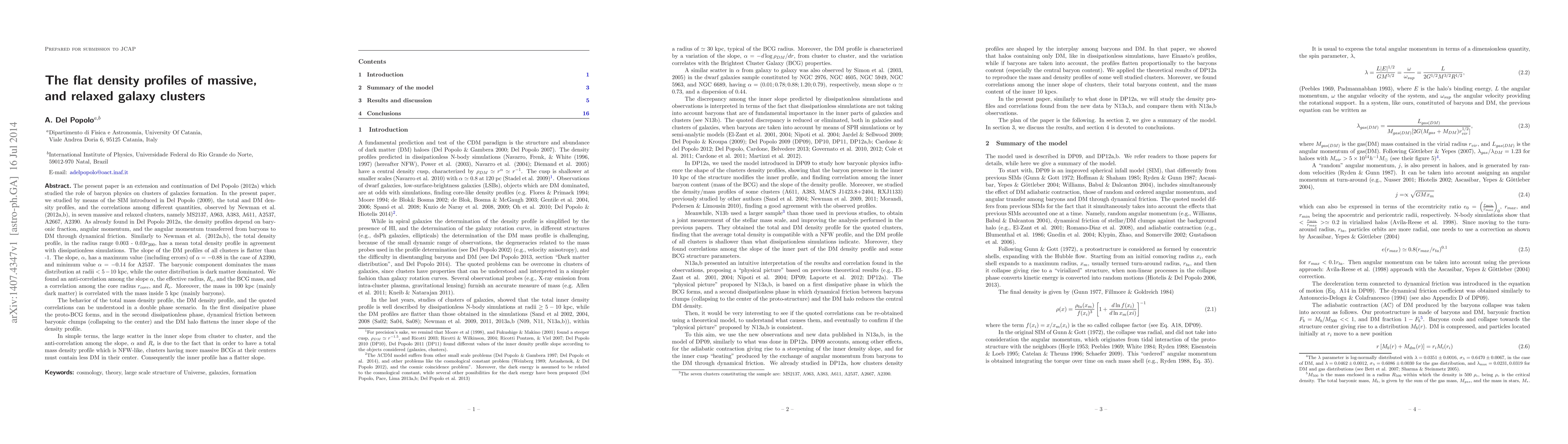 In the present paper, we studied by means of the SIM introduced in Del Popolo (2009), the total and DM density profiles, and the correlations among different quantities, observed by Newman et al. (2012a,b), in seven massive and relaxed clusters, namely MS2137, A963, A383, A611, A2537, A2667, A2390. Similarly to Newman et al. (2012a,b), the total density profile, in the radius range 0.003 - 0.03$r_{200}$, has a mean total density profile in agreement with dissipationless simulations. The slope of the DM profiles of all clusters is flatter than -1. The slope, $\alpha$, has a maximum value (including errors) of $\alpha=-0.88$ in the case of A2390, and minimum value $\alpha=-0.14$ for A2537. The baryonic component dominates the mass distribution at radii $< 5-10$ kpc, while the outer distribution is dark matter dominated. We found an anti-correlation among the slope $\alpha$, the effective radius, $R_e$, and the BCG mass, and a correlation among the core radius $r_{core}$, and $R_e$. Moreover, the mass in 100 kpc (mainly dark matter) is correlated with the mass inside 5 kpc (mainly baryons). The behavior of the total mass density profile, the DM density profile, and the quoted correlations can be understood in a double phase scenario. In the first dissipative phase the proto-BCG forms, and in the second dissipationless phase, dynamical friction between baryonic clumps (collapsing to the center) and the DM halo flattens the inner slope of the density profile. In simple terms, the large scatter in the inner slope from cluster to cluster, and the anti-correlation among the slope, $\alpha$ and $R_e$ is due to the fact that in order to have a total mass density profile which is NFW-like, clusters having more massive BCGs at their centers must contain less DM in their center. Consequently the inner profile has a flatter slope.