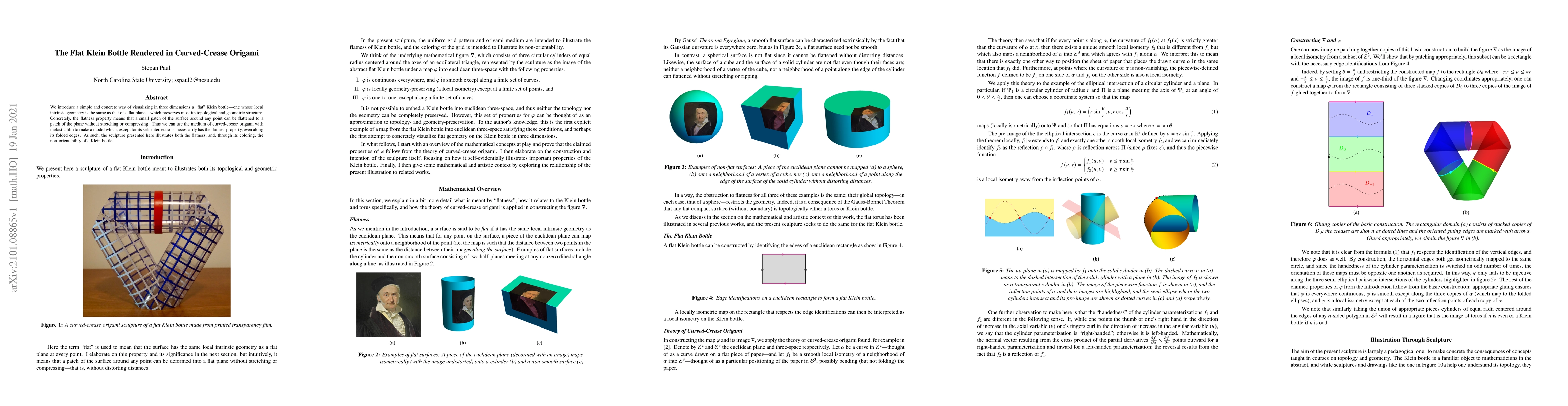 We introduce a simple and concrete way of visualizing in three dimensions a "flat" Klein bottle -- one whose local intrinsic geometry is the same as that of a flat plane -- which preserves most its topological and geometric structure. Concretely, the flatness property means that a small patch of the surface around any point can be flattened to a patch of the plane without stretching or compressing. Thus we can use the medium of curved-crease origami with inelastic film to make a model which, except for its self-intersections, necessarily has the flatness property, even along its folded edges. As such, the sculpture presented here illustrates both the flatness, and, through its coloring, the non-orientability of a Klein bottle.