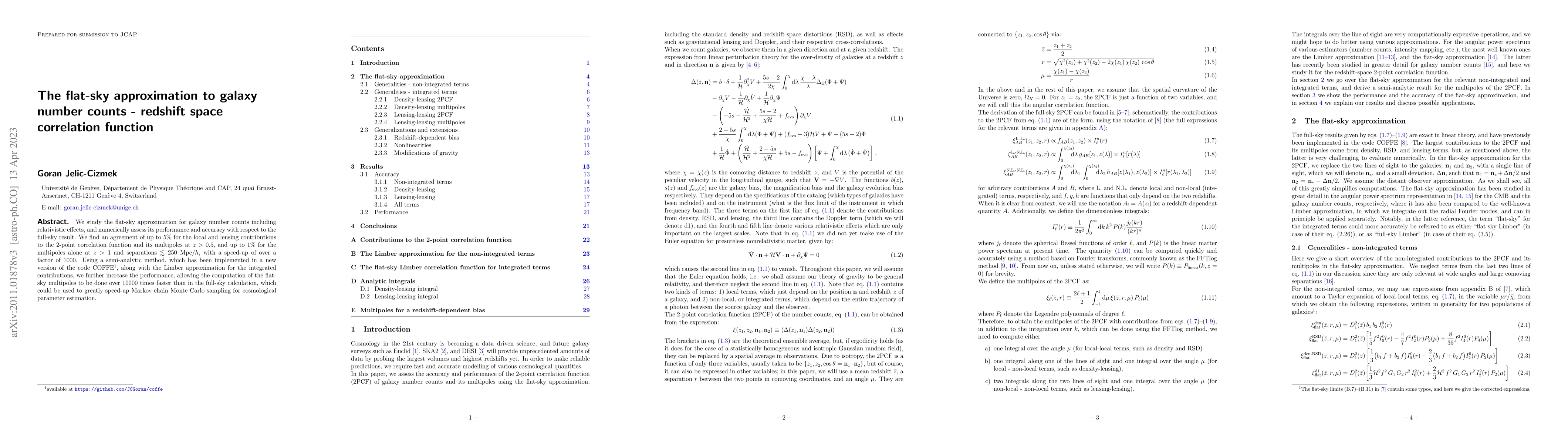 This paper evaluates the flat-sky approximation for galaxy number counts, finding it to be accurate up to 5% for local and lensing contributions at redshifts greater than 0.5, and up to 1% for multipoles alone at higher redshifts. The new COFFE code significantly speeds up calculations by a factor of 1000 compared to full-sky methods.