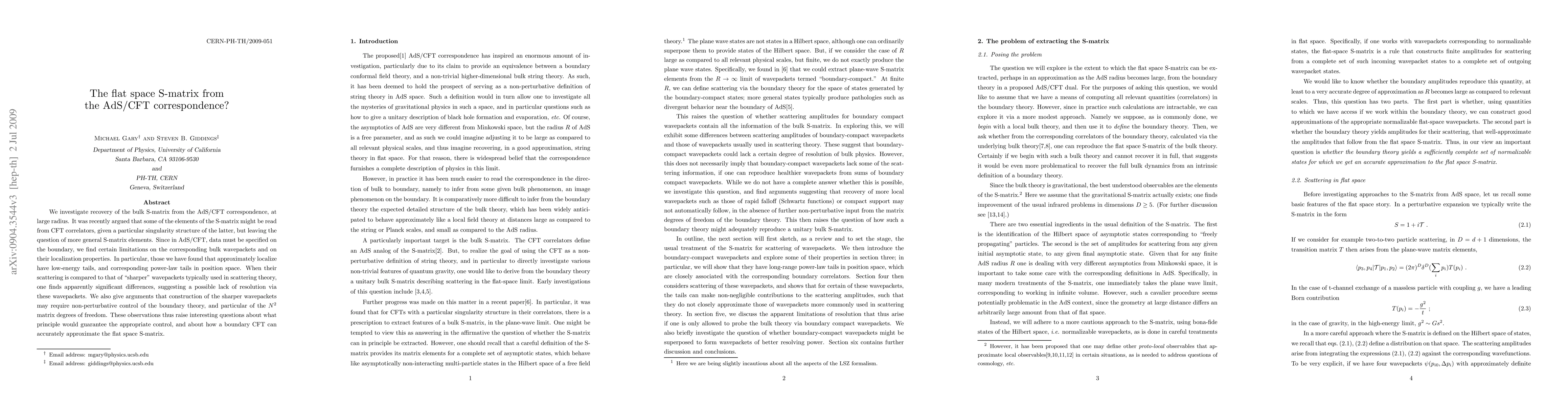 We investigate recovery of the bulk S-matrix from the AdS/CFT correspondence, at large radius. It was recently argued that some of the elements of the S-matrix might be read from CFT correlators, given a particular singularity structure of the latter, but leaving the question of more general S-matrix elements. Since in AdS/CFT, data must be specified on the boundary, we find certain limitations on the corresponding bulk wavepackets and on their localization properties. In particular, those we have found that approximately localize have low-energy tails, and corresponding power-law tails in position space. When their scattering is compared to that of "sharper" wavepackets typically used in scattering theory, one finds apparently significant differences, suggesting a possible lack of resolution via these wavepackets. We also give arguments that construction of the sharper wavepackets may require non-perturbative control of the boundary theory, and particular of the N^2 matrix degrees of freedom. These observations thus raise interesting questions about what principle would guarantee the appropriate control, and about how a boundary CFT can accurately approximate the flat space S-matrix.