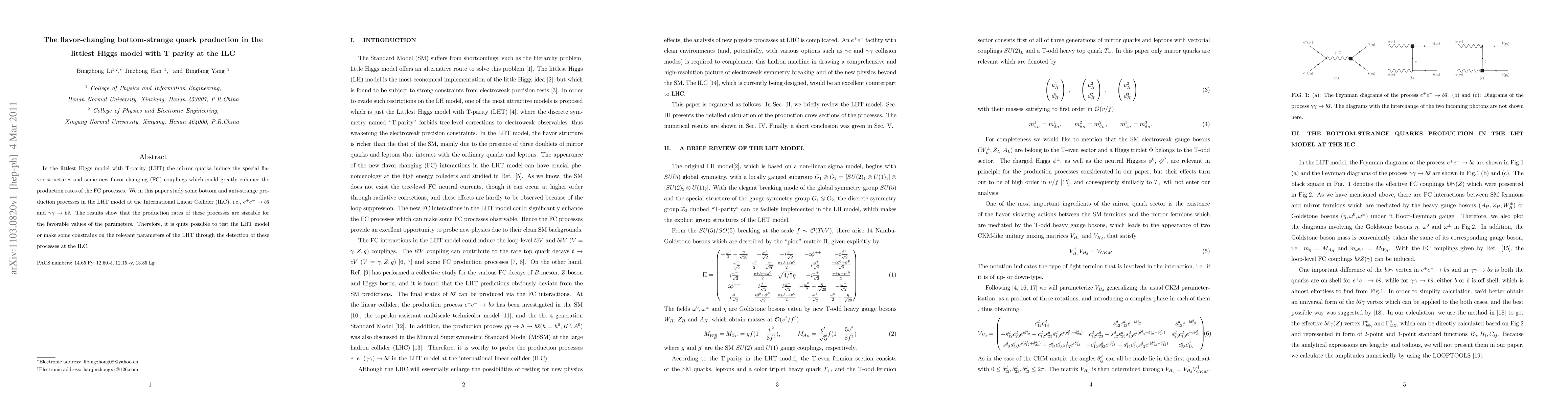 This paper investigates flavor-changing bottom-strange quark production in the littlest Higgs model with T-parity at the International Linear Collider (ILC). It finds that mirror quarks in the LHT model enhance the production rates of $e^+e^-\rightarrow b\bar{s}$ and $\gamma\gamma\rightarrow b\bar{s}$, suggesting these processes could be used to test the LHT model or constrain its parameters.