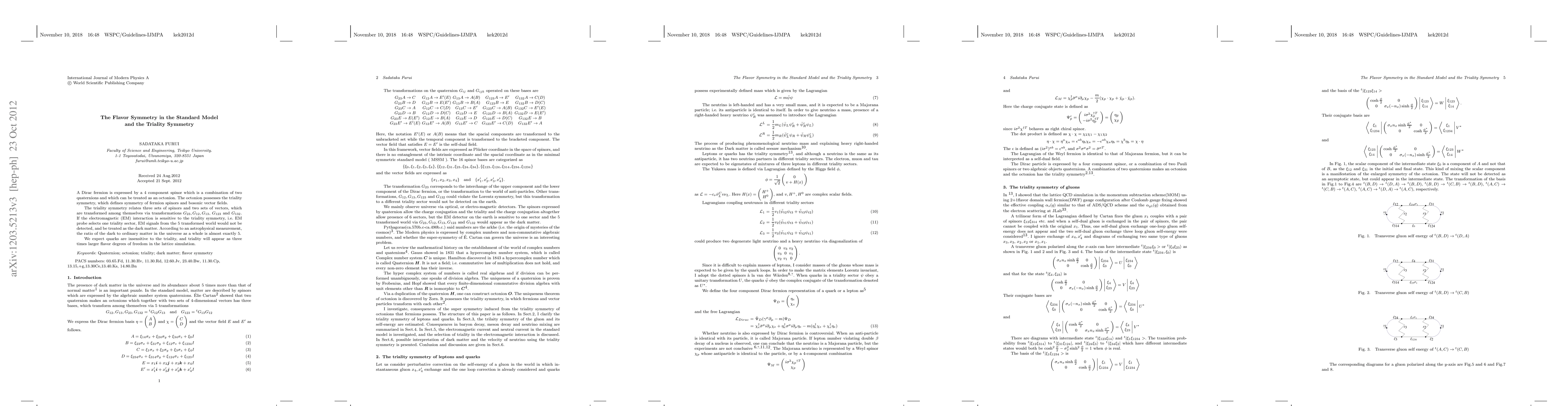 A Dirac fermion is expressed by a 4 component spinor which is a combination of two quaternions and which can be treated as an octonion. The octonion possesses the triality symmetry, which defines symmetry of fermion spinors and bosonic vector fields. The triality symmetry relates three sets of spinors and two sets of vectors, which are transformed among themselves via transformations $G_{23}, G_{12}, G_{13}$, $G_{123}$ and $G_{132}$. If the electromagnetic (EM) interaction is sensitive to the triality symmetry, i.e. EM probe selects one triality sector, EM signals from the 5 transformed world would not be detected, and be treated as the dark matter. According to an astrophysical measurement, the ratio of the dark to ordinary matter in the universe as a whole is almost exactly 5. We expect quarks are insensitive to the triality, and triality will appear as three times larger flavor degrees of freedom in the lattice simulation.