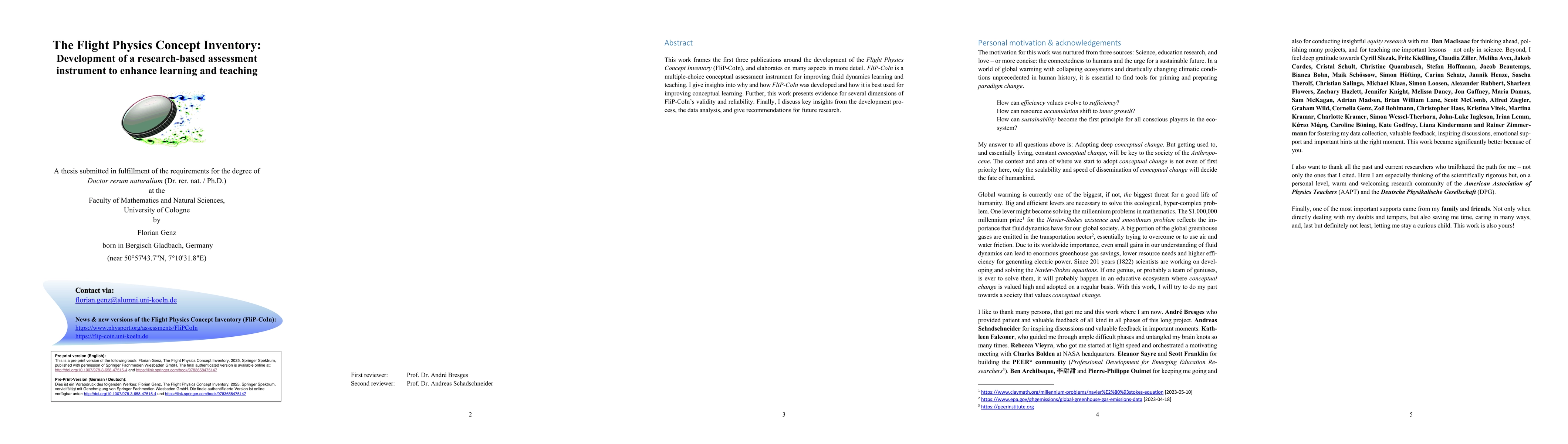 This work frames the first three publications around the development of the Flight Physics Concept Inventory (FliP-CoIn), and elaborates on many aspects in more detail. FliP-CoIn is a multiple-choice conceptual assessment instrument for improving fluid dynamics learning and teaching. I give insights into why and how FliP-CoIn was developed and how it is best used for improving conceptual learning. Further, this work presents evidence for several dimensions of FliP-CoIn's validity and reliability. Finally, I discuss key insights from the development process, the data analysis, and give recommendations for future research. This is a pre print version of the following book: Florian Genz, The Flight Physics Concept Inventory, 2025, Springer Spektrum, published with permission of Springer Fachmedien Wiesbaden GmbH. The final authenticated version is available online at: http://doi.org/10.1007/978-3-658-47515-4 and https://link.springer.com/book/9783658475147