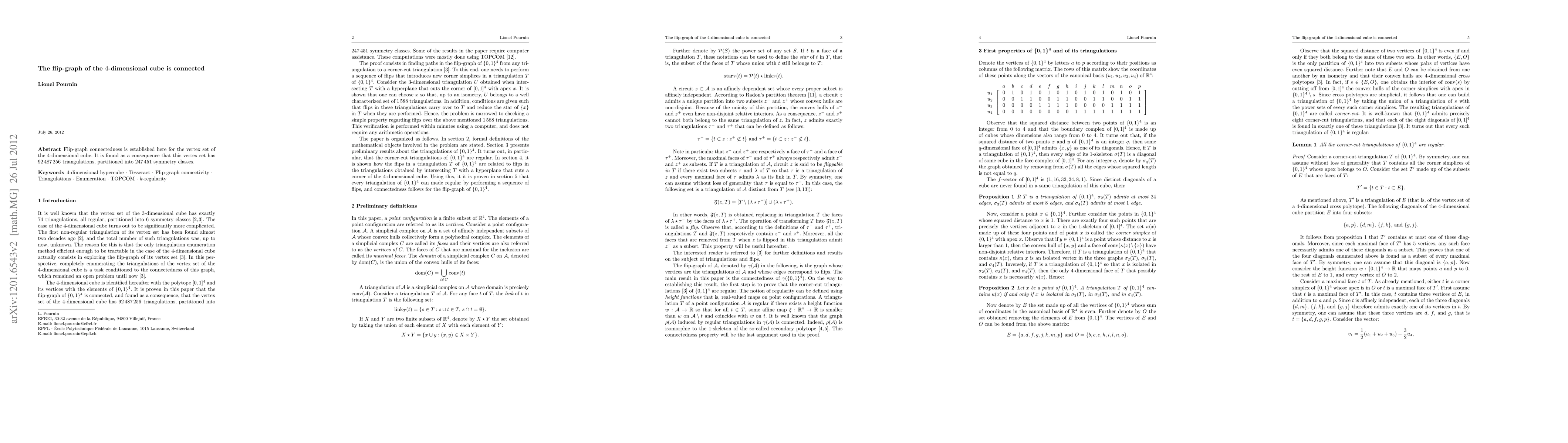 The research proves that the flip-graph of the 4-dimensional cube is connected, revealing 92,487,256 triangulations of its vertex set, which are divided into 247,451 distinct symmetry classes. This connectivity indicates that any triangulation can be transformed into any other through a sequence of local flips.