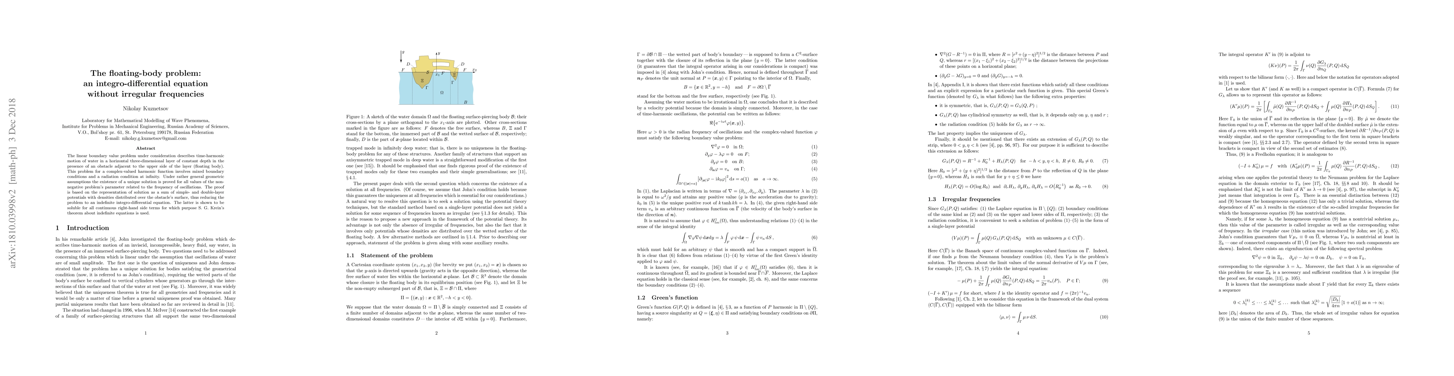 The linear boundary value problem under consideration describes time-harmonic motion of water in a horizontal three-dimensional layer of constant depth in the presence of an obstacle adjacent to the upper side of the layer (floating body). This problem for a complex-valued harmonic function involves mixed boundary conditions and a radiation condition at infinity. Under rather general geometric assumptions the existence of a unique solution is proved for all values of the nonnegative problem's parameter related to the frequency of oscillations. The proof is based on the representation of solution as a sum of simple- and double-layer potentials with densities distributed over the obstacle's surface, thus reducing the problem to an indefinite integro-differential equation. The latter is shown to be soluble for all continuous right-hand side terms for which purpose S.~G. Krein's theorem about indefinite equations is used.