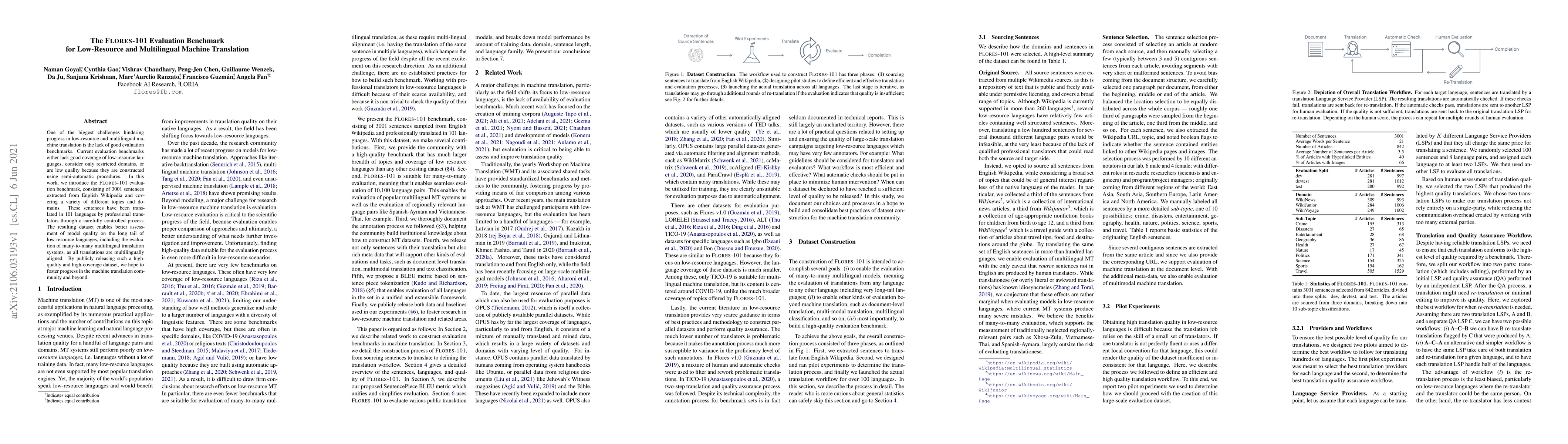 The FLORES-101 evaluation benchmark addresses the lack of quality multilingual machine translation datasets for low-resource languages by providing 3001 sentences translated into 101 languages, enabling better assessment of translation models across diverse topics and domains. This high-quality, publicly available dataset aims to advance progress in multilingual machine translation.
