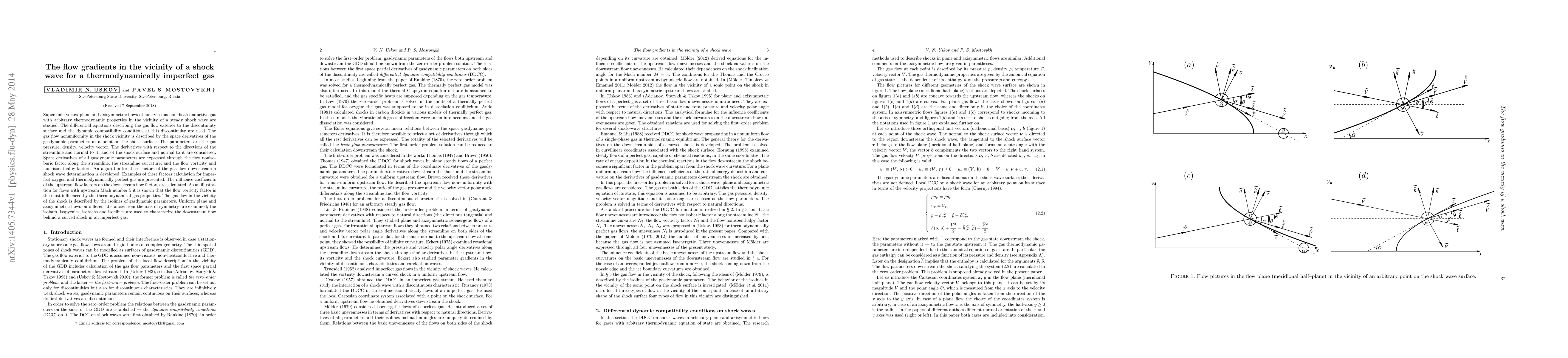 Supersonic vortex plane and axisymmetric flows of non-viscous non-heatconductive gas with arbitrary thermodynamic properties in the vicinity of a steady shock wave are studied. The differential equations describing the gas flow exterior to the discontinuity surface and the dynamic compatibility conditions at this discontinuity are used. The gas flow nonuniformity in the shock vicinity is described by the space derivatives of the gasdynamic parameters at a point on the shock surface. The parameters are the gas pressure, density, velocity vector. The derivatives with respect to the directions of the streamline and normal to it, and of the shock surface and normal to it are considered. Space derivatives of all gasdynamic parameters are expressed through the flow nonisobaric factor along the streamline, the streamline curvature, and the flow vorticity and non-isoenthalpy factors. An algorithm for these factors of the gas flow downstream a shock wave determination is developed. Examples of these factors calculation for imperfect oxygen and thermodynamically perfect gas are presented. The influence coefficients of the upstream flow factors on the downstream flow factors are calculated. As an illustration for flows with upstream Mach number 5 it is shown that the flow vorticity factor is the most influenced by the thermodynamical gas properties. The gas flow in the vicinity of the shock is described by the isolines of gasdynamic parameters. Uniform plane and axisymmetric flows on different distances from the axis of symmetry are examined; the isobars, isopycnics, isotachs and isoclines are used to characterize the downstream flow behind a curved shock in an imperfect gas.