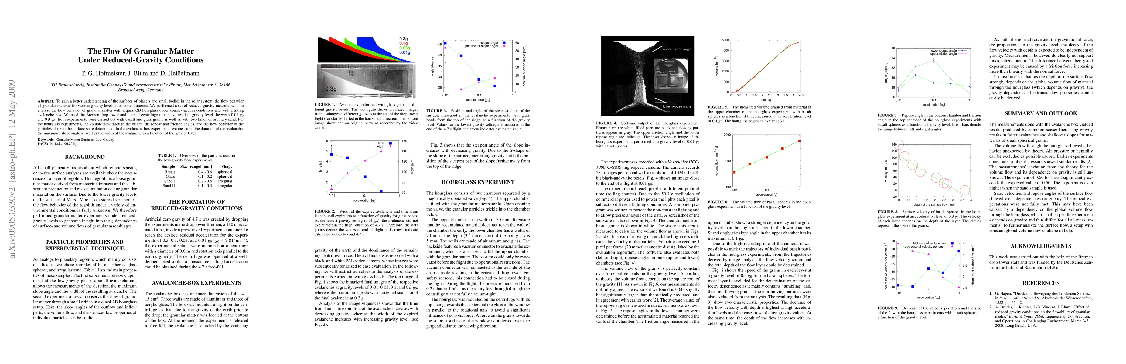 To gain a better understanding of the surfaces of planets and small bodies in the solar system, the flow behavior of granular material for various gravity levels is of utmost interest. We performed a set of reduced-gravity measurements to analyze the flow behavior of granular matter with a quasi-2D hourglass under coarse-vacuum conditions and with a tilting avalanche box. We used the Bremen drop tower and a small centrifuge to achieve residual-gravity levels between 0.01 g and 0.3 g. Both experiments were carried out with basalt and glass grains as well as with two kinds of ordinary sand. For the hourglass experiments, the volume flow through the orifice, the repose and friction angles, and the flow behavior of the particles close to the surface were determined. In the avalanche-box experiment, we measured the duration of the avalanche, the maximum slope angle as well as the width of the avalanche as a function of the gravity level.
