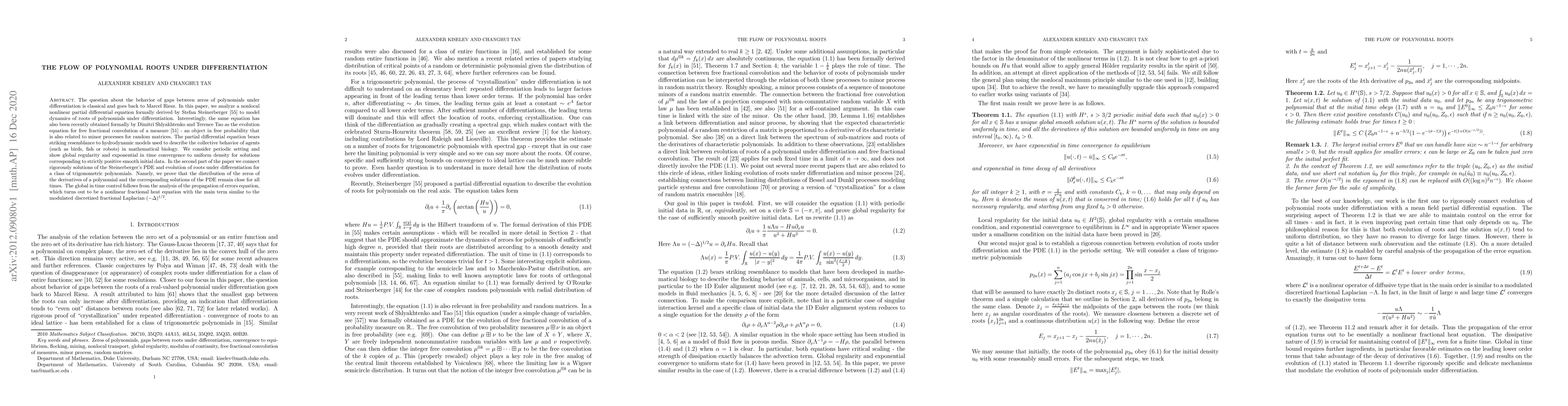 The question about the behavior of gaps between zeros of polynomials under differentiation is classical and goes back to Marcel Riesz. In this paper, we analyze a nonlocal nonlinear partial differential equation formally derived by Stefan Steinerberger to model dynamics of roots of polynomials under differentiation. Interestingly, the same equation has also been recently obtained formally by Dimitri Shlyakhtenko and Terence Tao as the evolution equation for free fractional convolution of a measure - an object in free probability that is also related to minor processes for random matrices. The partial differential equation bears striking resemblance to hydrodynamic models used to describe the collective behavior of agents (such as birds, fish or robots) in mathematical biology. We consider periodic setting and show global regularity and exponential in time convergence to uniform density for solutions corresponding to strictly positive smooth initial data. In the second part of the paper we connect rigorously solutions of the Steinerberger's PDE and evolution of roots under differentiation for a class of trigonometric polynomials. Namely, we prove that the distribution of the zeros of the derivatives of a polynomial and the corresponding solutions of the PDE remain close for all times. The global in time control follows from the analysis of the propagation of errors equation, which turns out to be a nonlinear fractional heat equation with the main term similar to the modulated discretized fractional Laplacian $(-\Delta)^{1/2}$.