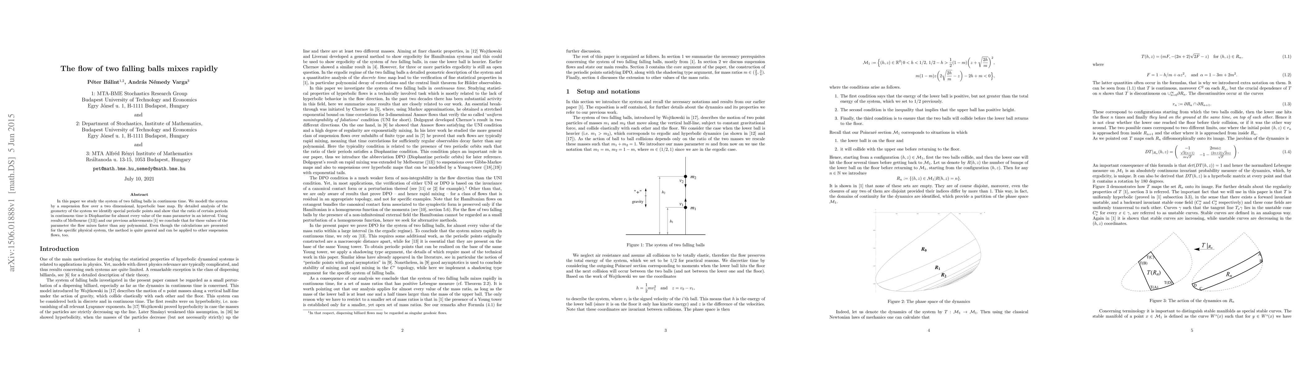In this paper we study the system of two falling balls in continuous time. We modell the system by a suspension flow over a two dimensional, hyperbolic base map. By detailed analysis of the geometry of the system we identify special periodic points and show that the ratio of certain periods in continuous time is Diophantine for almost every value of the mass parameter in an interval. Using results of Melbourne (\cite{M}) and our previous achievements \cite{BBNV} we conclude that for these values of the parameter the flow mixes faster than any polynomial. Even though the calculations are presented for the specific physical system, the method is quite general and can be applied to other suspension flows, too.