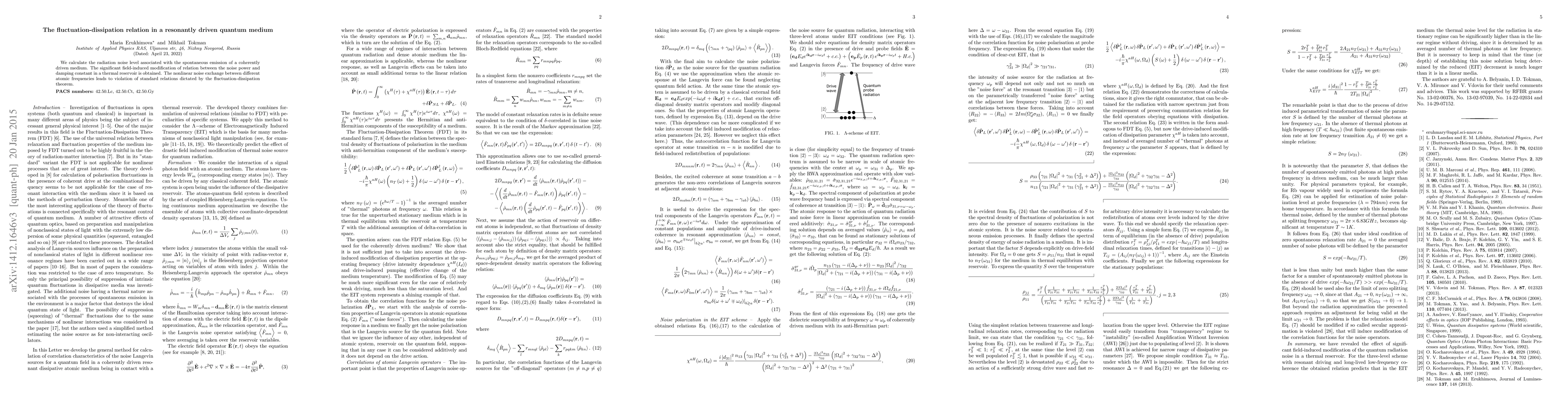 This paper investigates the radiation noise in a resonantly driven quantum medium, revealing significant field-induced changes in the noise-power to damping constant relationship. The study finds that nonlinear interactions among different atomic frequencies violate the standard fluctuation-dissipation theorem.