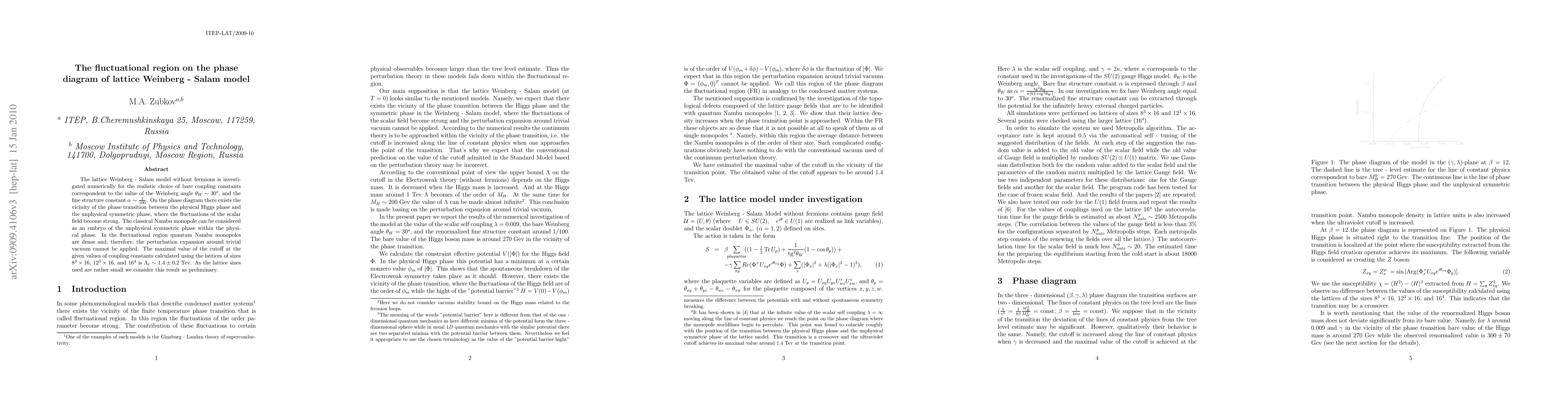 The lattice Weinberg - Salam model without fermions is investigated numerically for the realistic choice of bare coupling constants correspondent to the value of the Weinberg angle $\theta_W \sim 30^o$, and the fine structure constant $\alpha \sim {1/100}$. On the phase diagram there exists the vicinity of the phase transition between the physical Higgs phase and the unphysical symmetric phase, where the fluctuations of the scalar field become strong. The classical Nambu monopole can be considered as an embryo of the unphysical symmetric phase within the physical phase. In the fluctuational region quantum Nambu monopoles are dense and, therefore, the perturbation expansion around trivial vacuum cannot be applied. The maximal value of the cutoff at the given values of coupling constants calculated using the lattices of sizes $8^3\times 16$, $12^3\times 16$, and $16^4$ is $\Lambda_c \sim 1.4 \pm 0.2$ Tev. As the lattice sizes used are rather small we consider this result as preliminary.