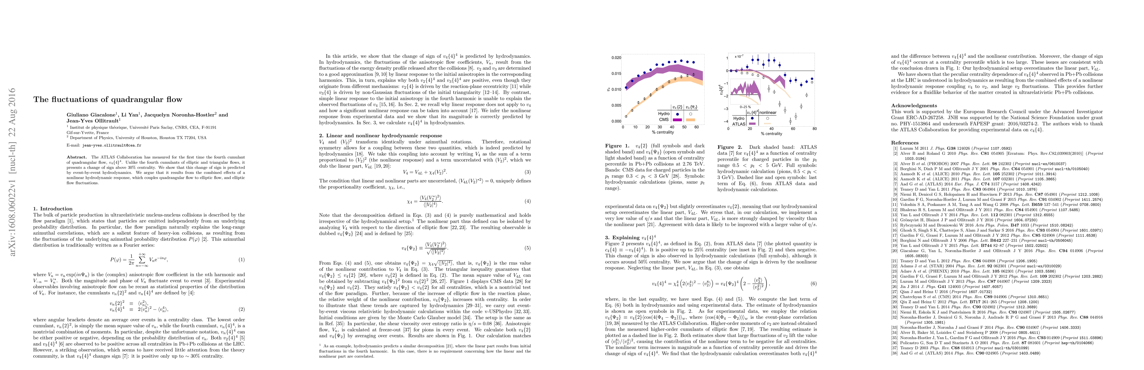 The ATLAS Collaboration measured the fourth cumulant of quadrangular flow, $v_4\{4\}^4$, using event-by-event hydrodynamics to model the fluctuations of anisotropic flow coefficients, $V_n$, resulting from initial energy density fluctuations.