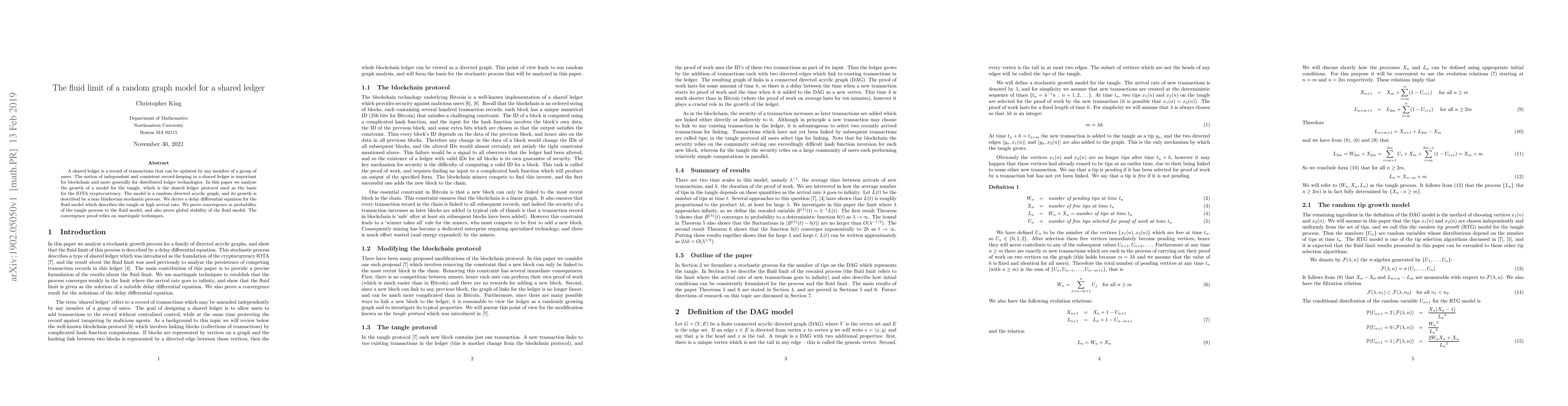 A shared ledger is a record of transactions that can be updated by any member of a group of users. The notion of independent and consistent record-keeping in a shared ledger is important for blockchain and more generally for distributed ledger technologies. In this paper we analyze the growth of a model for the tangle, which is the shared ledger protocol used as the basis for the IOTA cryptocurrency. The model is a random directed acyclic graph, and its growth is described by a non-Markovian stochastic process. We derive a delay differential equation for the fluid model which describes the tangle at high arrival rate. We prove convergence in probability of the tangle process to the fluid model, and also prove global stability of the fluid model. The convergence proof relies on martingale techniques.