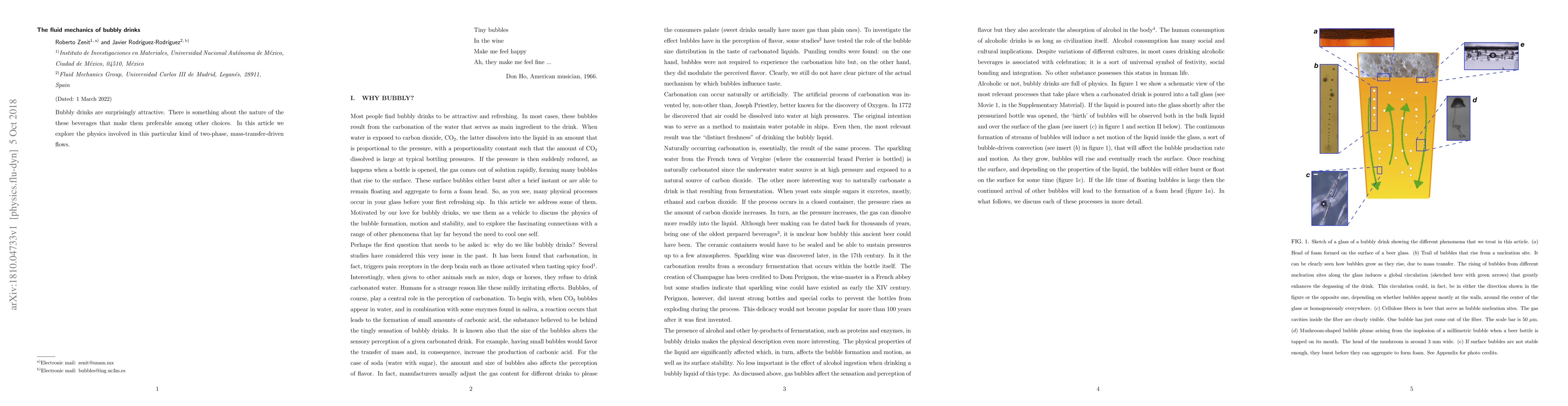 Summary: This paper investigates the fluid mechanics of bubbly drinks, focusing on the physics of two-phase, mass-transfer-driven flows that contribute to their unique appeal. It delves into the dynamics of bubbles and their interactions within the liquid.
