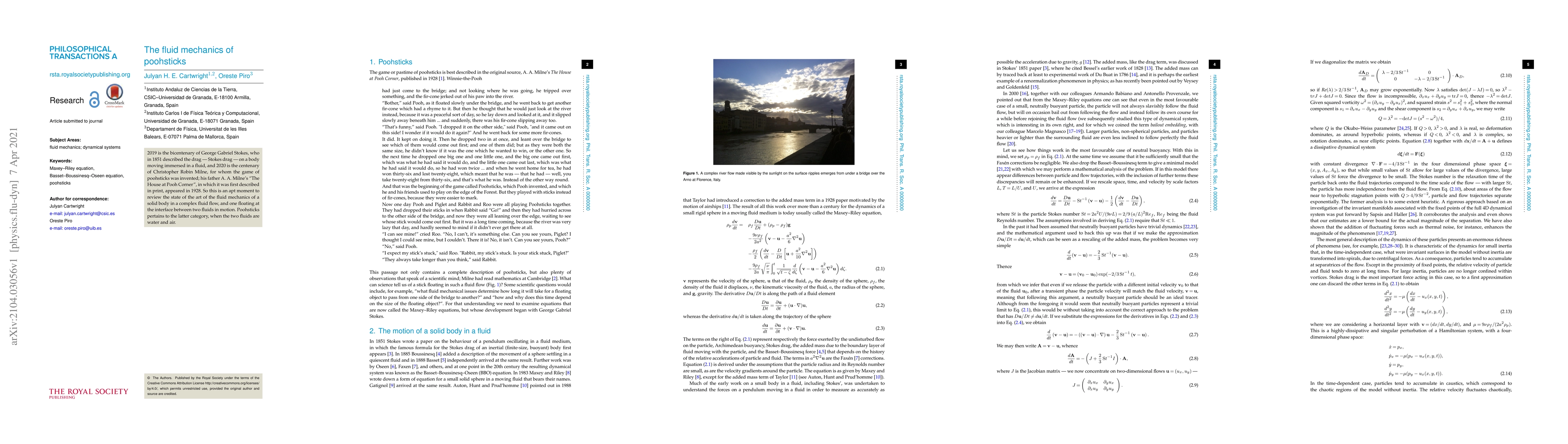 2019 is the bicentenary of George Gabriel Stokes, who in 1851 described the drag - Stokes drag - on a body moving immersed in a fluid, and 2020 is the centenary of Christopher Robin Milne, for whom the game of poohsticks was invented; his father A. A. Milne's "The House at Pooh Corner", in which it was first described in print, appeared in 1928. So this is an apt moment to review the state of the art of the fluid mechanics of a solid body in a complex fluid flow, and one floating at the interface between two fluids in motion. Poohsticks pertains to the latter category, when the two fluids are water and air.