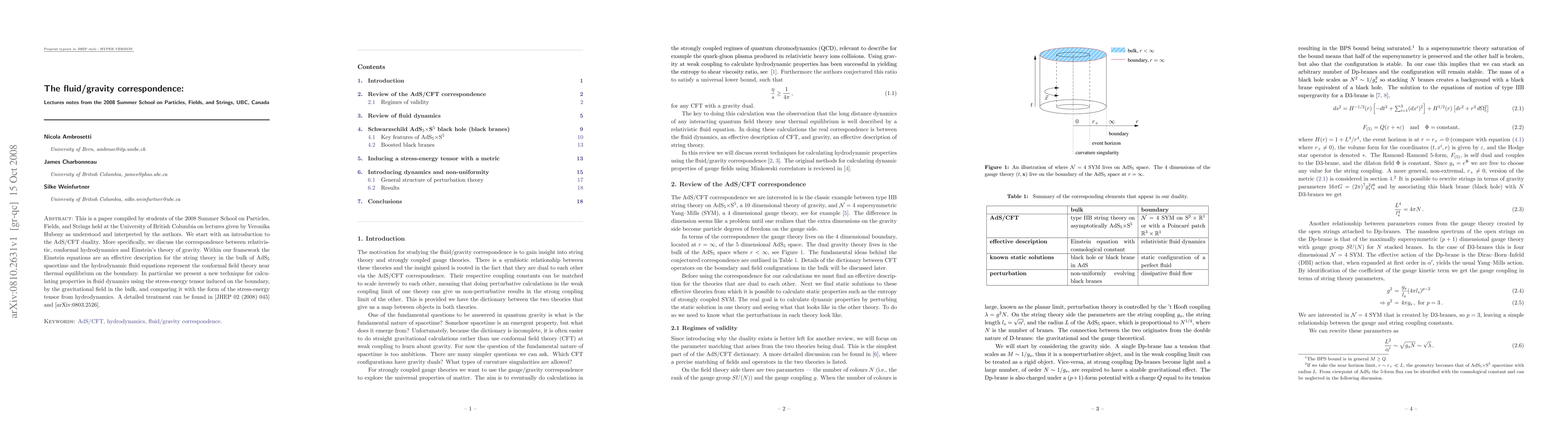 This is a paper compiled by students of the 2008 Summer School on Particles, Fields, and Strings held at the University of British Columbia on lectures given by Veronika Hubeny as understood and interpreted by the authors. We start with an introduction to the AdS/CFT duality. More specifically, we discuss the correspondence between relativistic, conformal hydrodynamics and Einstein's theory of gravity. Within our framework the Einstein equations are an effective description for the string theory in the bulk of AdS_5 spacetime and the hydrodynamic fluid equations represent the conformal field theory near thermal equilibrium on the boundary. In particular we present a new technique for calculating properties in fluid dynamics using the stress-energy tensor induced on the boundary, by the gravitational field in the bulk, and comparing it with the form of the stress-energy tensor from hydrodynamics. A detailed treatment can be found in [JHEP 02 (2008) 045] and [arXiv:0803.2526].