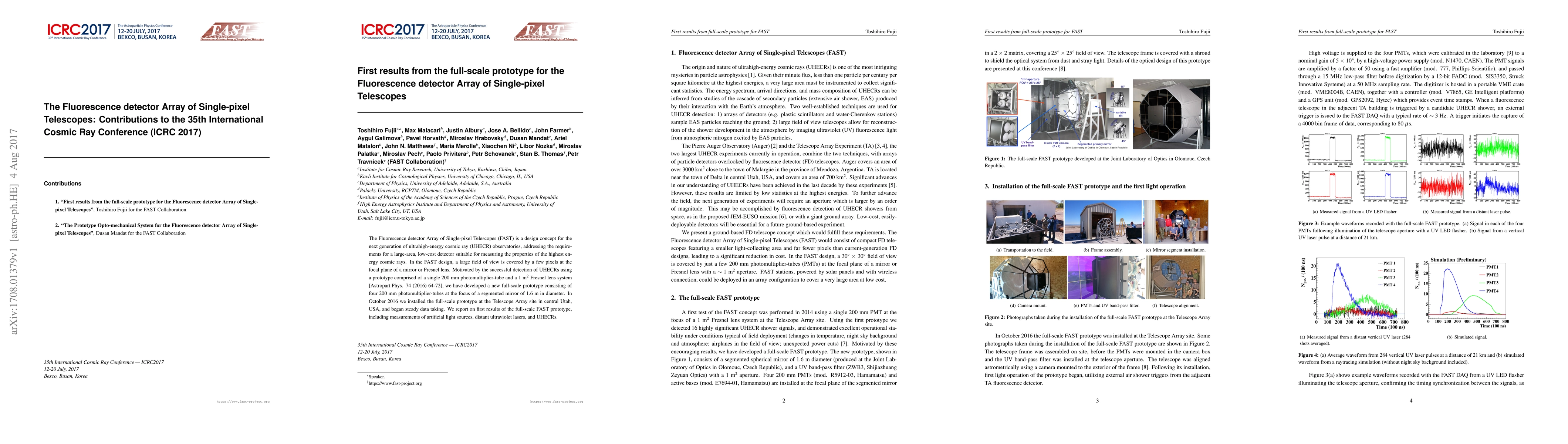The Fluorescence detector Array of Single-pixel Telescopes (FAST) presented its contributions to the 35th International Cosmic Ray Conference (ICRC 2017) in Busan, Korea, showcasing advancements in detecting high-energy cosmic rays through innovative fluorescence detection techniques. The findings highlight significant progress in cosmic ray observation and analysis.