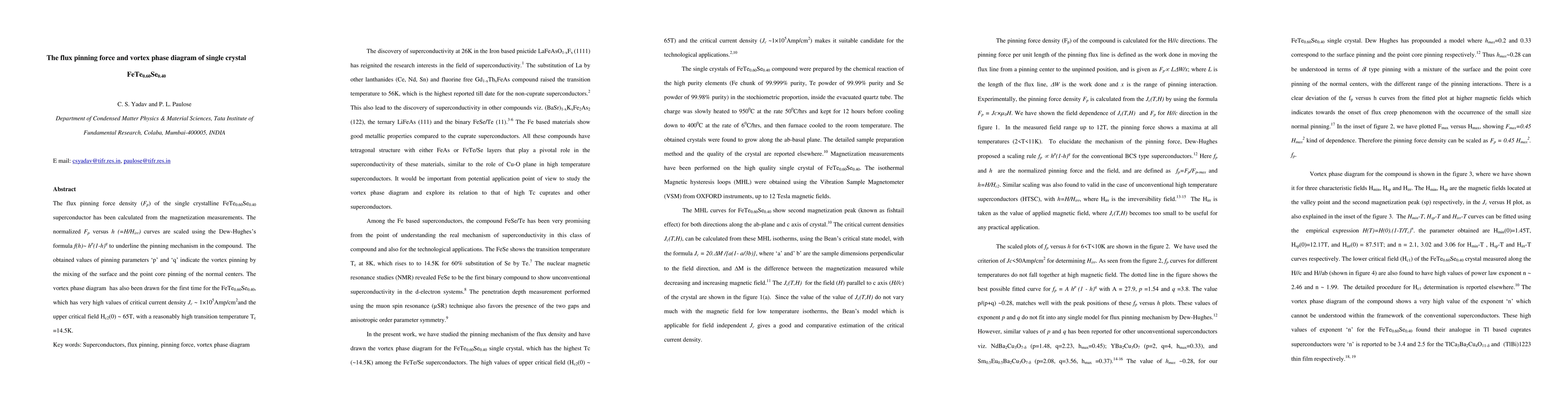 The flux pinning force density (Fp) of the single crystalline FeTe0.60Se0.40 superconductor has been calculated from the magnetization measurements. The normalized Fp versus h (=H/Hirr) curves are scaled using the Dew-Hughes formula to underline the pinning mechanism in the compound. The obtained values of pinning parameters p and q indicate the vortex pinning by the mixing of the surface and the point core pinning of the normal centers. The vortex phase diagram has also been drawn for the first time for the FeTe0.60Se0.40, which has very high values of critical current density Jc ~ 1.10(5) Amp/cm2 and the upper critical field Hc2(0) = 65T, with a reasonably high transition temperature Tc =14.5K.