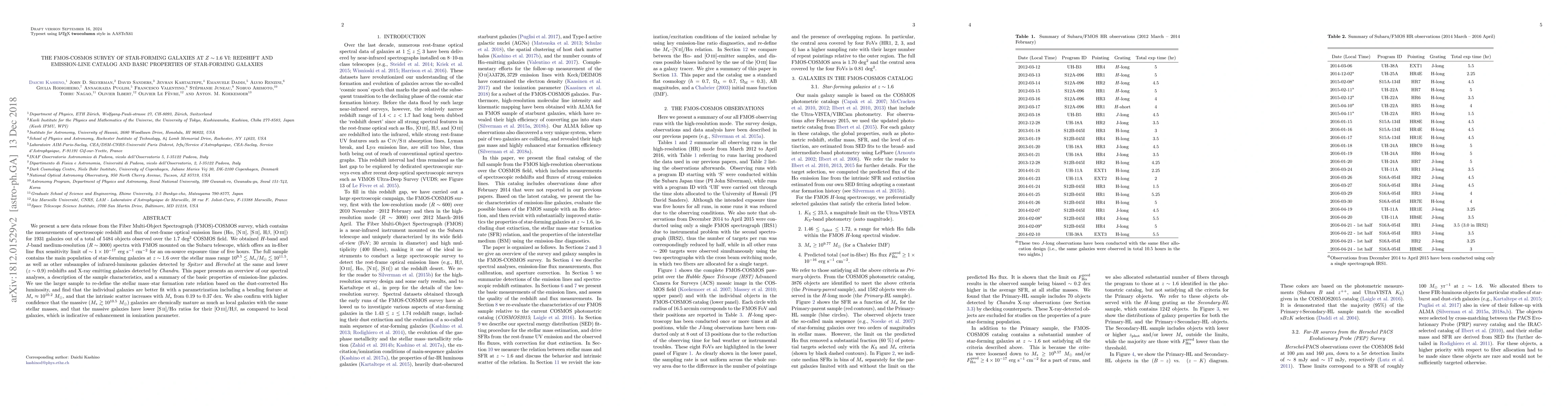 We present a new data release from the Fiber Multi-Object Spectrograph (FMOS)-COSMOS survey, which contains the measurements of spectroscopic redshift and flux of rest-frame optical emission lines (H$\alpha$, [NII], [SII], H$\beta$, [OIII]) for 1931 galaxies out of a total of 5484 objects observed over the 1.7 deg$^2$ COSMOS field. We obtained $H$-band and $J$-band medium-resolution ($R\sim3000$) spectra with FMOS mounted on the Subaru telescope, which offers an in-fiber line flux sensitivity limit of $\sim 1 \times 10^{-17}~\mathrm{erg~s^{-1}~cm^{-2}}$ for an on-source exposure time of five hours. The full sample contains the main population of star-forming galaxies at $z\sim1.6$ over the stellar mass range $10^{9.5}\lesssim M_\ast/M_\odot \lesssim 10^{11.5}$, as well as other subsamples of infrared-luminous galaxies detected by Spitzer and Herschel at the same and lower ($z\sim0.9$) redshifts and X-ray emitting galaxies detected by Chandra. This paper presents an overview of our spectral analyses, a description of the sample characteristics, and a summary of the basic properties of emission-line galaxies. We use the larger sample to re-define the stellar mass--star formation rate relation based on the dust-corrected H$\alpha$ luminosity, and find that the individual galaxies are better fit with a parametrization including a bending feature at $M_\ast\approx10^{10.2}~M_\odot$, and that the intrinsic scatter increases with $M_\ast$ from 0.19 to $0.37$ dex. We also confirm with higher confidence that the massive ($M_\ast\gtrsim10^{10.5}~M_\odot$) galaxies are chemically mature as much as local galaxies with the same stellar masses, and that the massive galaxies have lower [SII]/H$\alpha$ ratios for their [OIII]/H$\beta$, as compared to local galaxies, which is indicative of enhancement in ionization parameter.