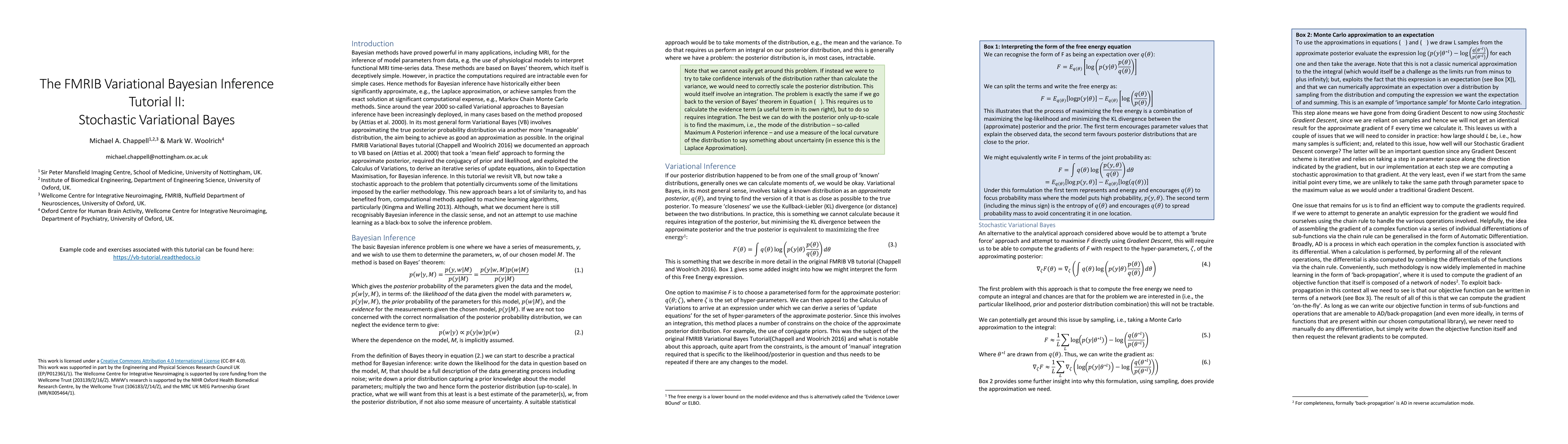 Bayesian methods have proved powerful in many applications for the inference of model parameters from data. These methods are based on Bayes' theorem, which itself is deceptively simple. However, in practice the computations required are intractable even for simple cases. Hence methods for Bayesian inference have historically either been significantly approximate, e.g., the Laplace approximation, or achieve samples from the exact solution at significant computational expense, e.g., Markov Chain Monte Carlo methods. Since around the year 2000 so-called Variational approaches to Bayesian inference have been increasingly deployed. In its most general form Variational Bayes (VB) involves approximating the true posterior probability distribution via another more 'manageable' distribution, the aim being to achieve as good an approximation as possible. In the original FMRIB Variational Bayes tutorial we documented an approach to VB based that took a 'mean field' approach to forming the approximate posterior, required the conjugacy of prior and likelihood, and exploited the Calculus of Variations, to derive an iterative series of update equations, akin to Expectation Maximisation. In this tutorial we revisit VB, but now take a stochastic approach to the problem that potentially circumvents some of the limitations imposed by the earlier methodology. This new approach bears a lot of similarity to, and has benefited from, computational methods applied to machine learning algorithms. Although, what we document here is still recognisably Bayesian inference in the classic sense, and not an attempt to use machine learning as a black-box to solve the inference problem.