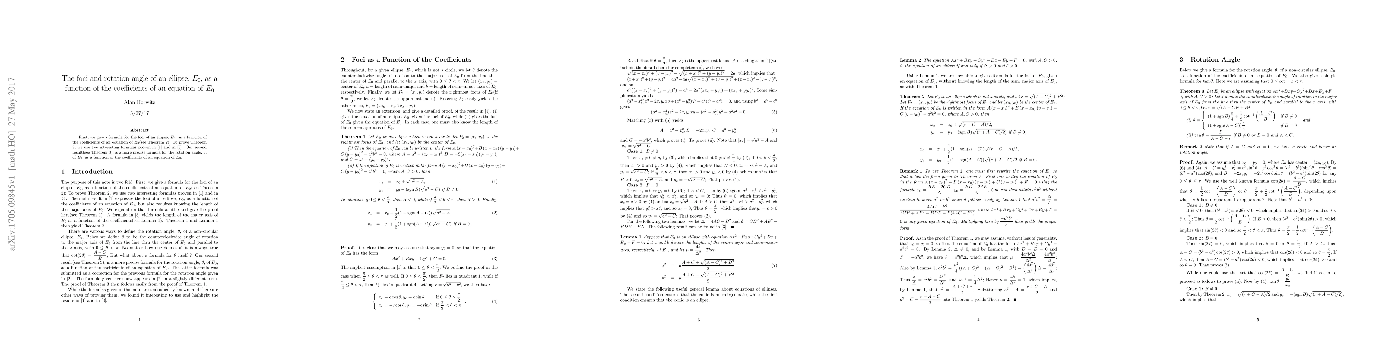 First, we give a formula for the foci of an ellipse, $E_0$, as a function of the coefficients of an equation of $E_0$(see Theorem T2). To prove Theorem T2, we use two interesting formulas proven in B and in S. Our second result(see Theorem T3), is a more precise formula for the rotation angle of $E_0$ as a function of the coefficients of an equation of $E_0$.