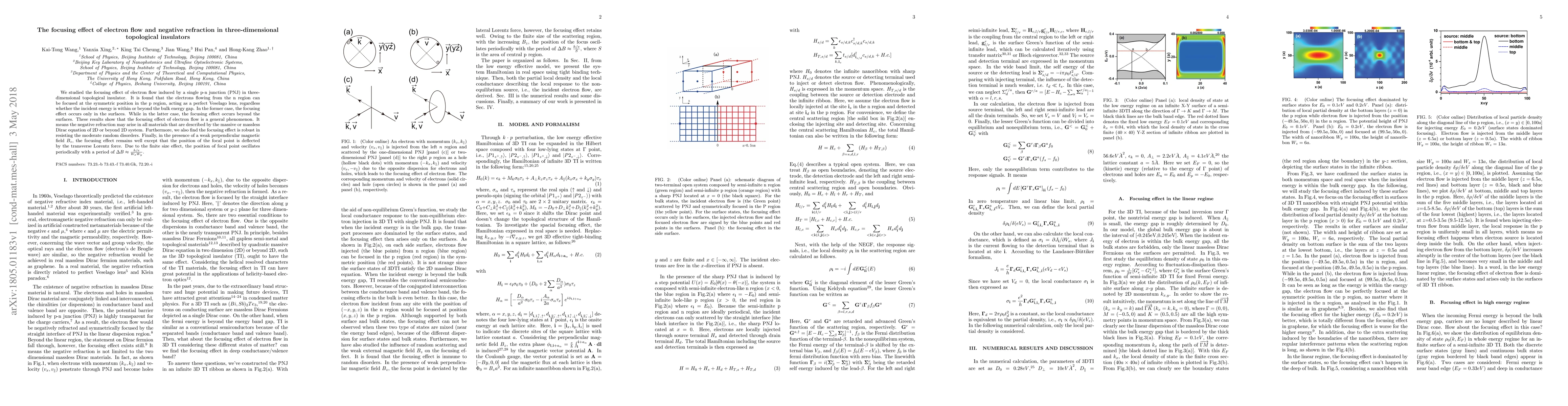 Researchers discovered that electrons in three-dimensional topological insulators can focus at a single point when flowing through a p-n junction, mimicking the behavior of a Veselago lens, regardless of incident energy or presence of disorders. This finding suggests that negative refraction may occur in various materials described by the Dirac equation.