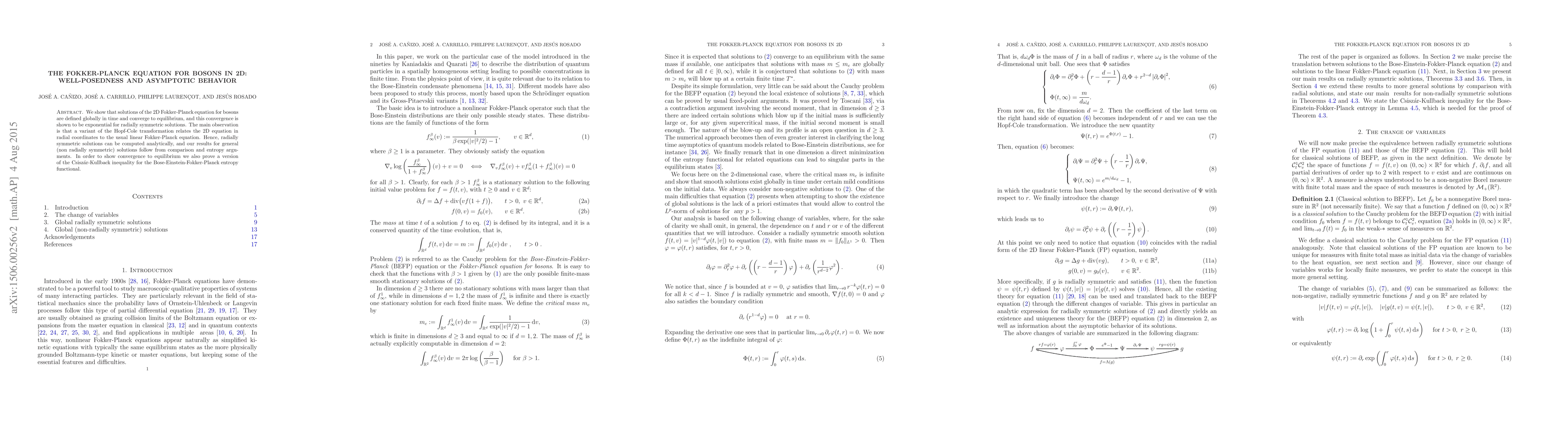 The paper proves global well-posedness and exponential convergence to equilibrium for solutions of the 2D Fokker-Planck equation for bosons, leveraging a Hopf-Cole transformation to relate it to the linear Fokker-Planck equation and employing entropy arguments to establish the results.
