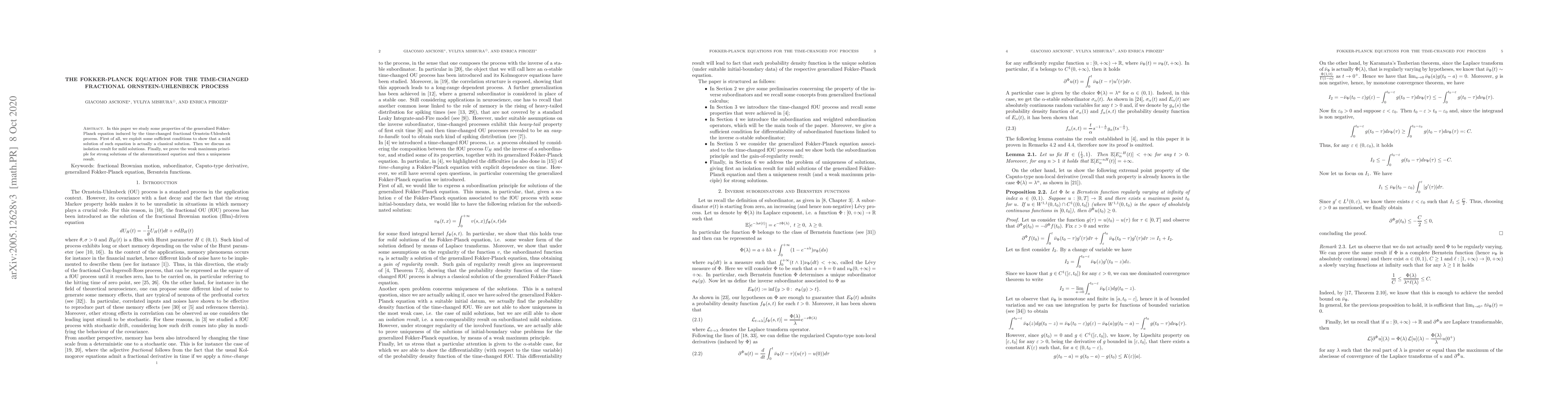 This paper investigates properties of the Fokker-Planck equation derived from a time-changed fractional Ornstein-Uhlenbeck process, proving that mild solutions are classical, establishing isolation results, and demonstrating the weak maximum principle and uniqueness for strong solutions.