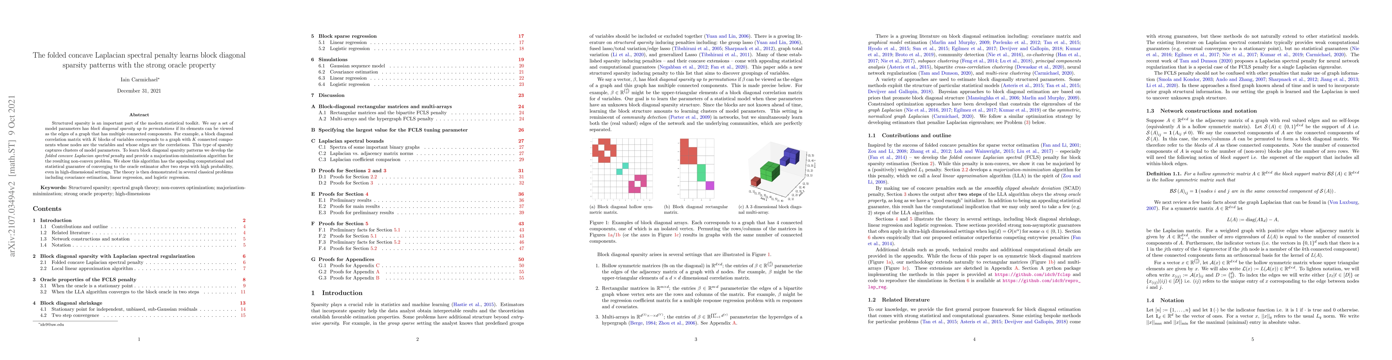 Structured sparsity is an important part of the modern statistical toolkit. We say a set of model parameters has block diagonal sparsity up to permutations if its elements can be viewed as the edges of a graph that has multiple connected components. For example, a block diagonal correlation matrix with K blocks of variables corresponds to a graph with K connected components whose nodes are the variables and whose edges are the correlations. This type of sparsity captures clusters of model parameters. To learn block diagonal sparsity patterns we develop the folded concave Laplacian spectral penalty and provide a majorization-minimization algorithm for the resulting non-convex problem. We show this algorithm has the appealing computational and statistical guarantee of converging to the oracle estimator after two steps with high probability, even in high-dimensional settings. The theory is then demonstrated in several classical problems including covariance estimation, linear regression, and logistic regression.