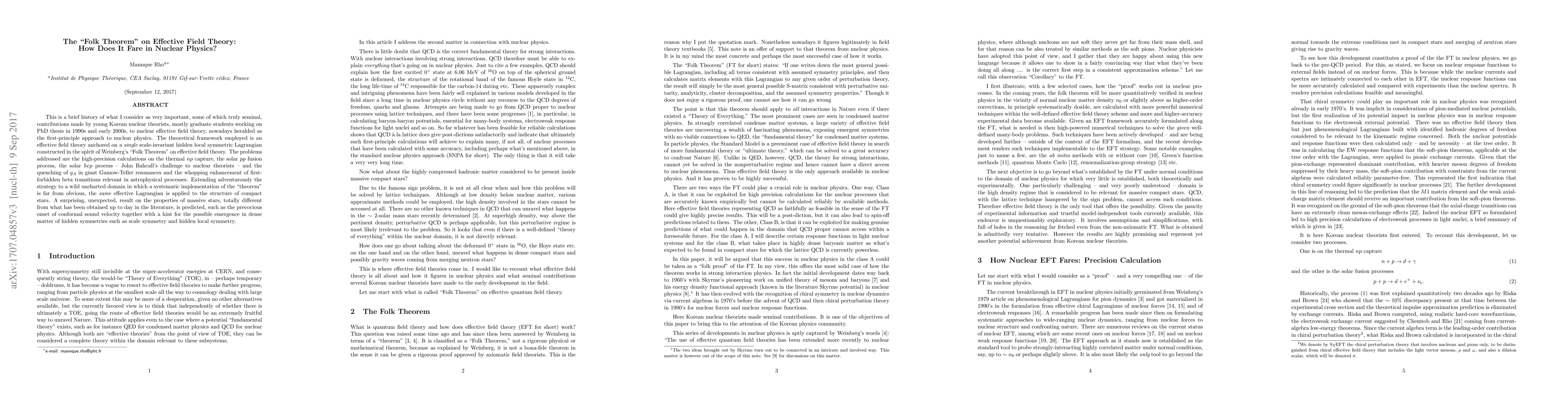This is a brief history of what I consider as very important, some of which truly seminal, contributions made by young Korean nuclear theorists, mostly graduate students working on PhD thesis in 1990's and early 2000's, to nuclear effective field theory, nowadays heralded as the first-principle approach to nuclear physics. The theoretical framework employed is an effective field theory anchored on a scale-invariant hidden local symmetric Lagrangian constructed along the line of Weinberg's "Folk Theorem" on effective field theory. The problems addressed are the high-precision calculations on the thermal $np$ capture, the solar $pp$ fusion process, the solar $hep$ process -- John Bahcall's challenge to nuclear theorists -- and the quenching of $g_A$ in giant Gamow-Teller resonances and the whopping enhancement of first-forbidden beta transitions in astrophysical processes. Extending adventurously the strategy to a wild uncharted domain in which a systematic implementation of the "theorem" is far from obvious, the same effective Lagrangian is applied to the structure of compact stars. A surprising result on the properties of massive stars, totally different from what has been obtained up to day in the literature, is predicted, such as the precocious onset of conformal sound velocity together with the possible emergence of hidden symmetries such as scale symmetry and hidden local symmetry.