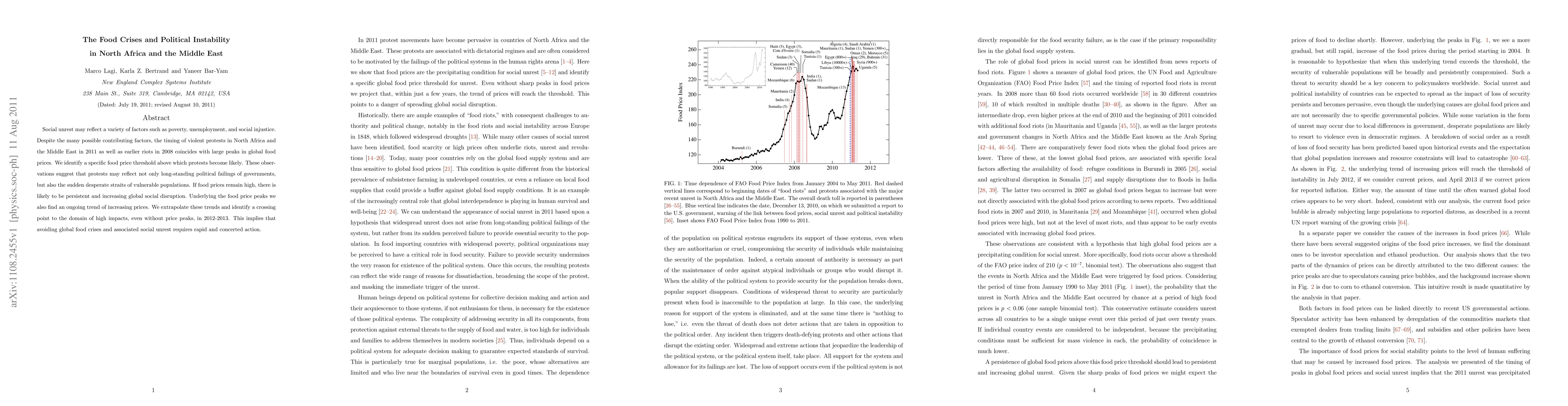 This paper examines the correlation between spikes in global food prices and the timing of violent protests in North Africa and the Middle East in 2011 and earlier in 2008, suggesting that food crises can exacerbate social unrest. It warns that without rapid action to address food price trends, persistent global social disruption is likely to increase.