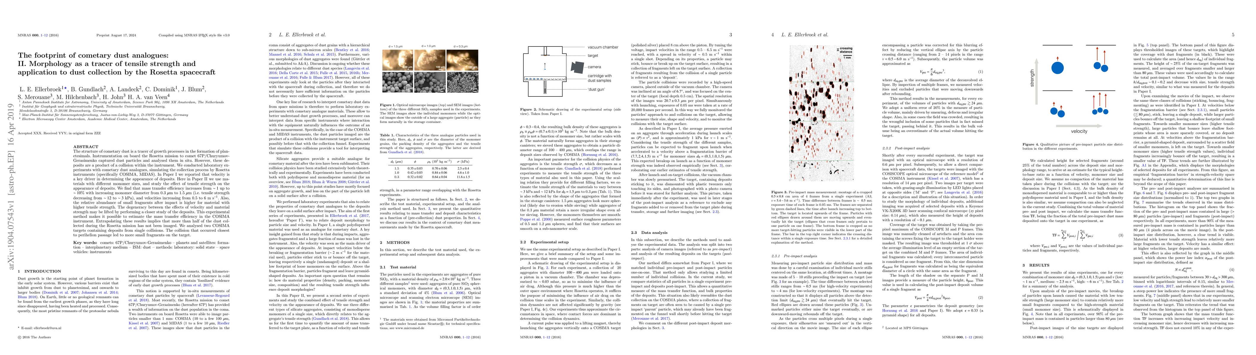 This paper investigates the morphology of cometary dust analogues to understand the impact of tensile strength on dust collection by the Rosetta spacecraft's instruments. The study finds that mass transfer efficiency increases with larger monomer sizes, indicating higher tensile strength leads to more small fragments post-impact, suggesting over half of the collected dust may remain unimaged.