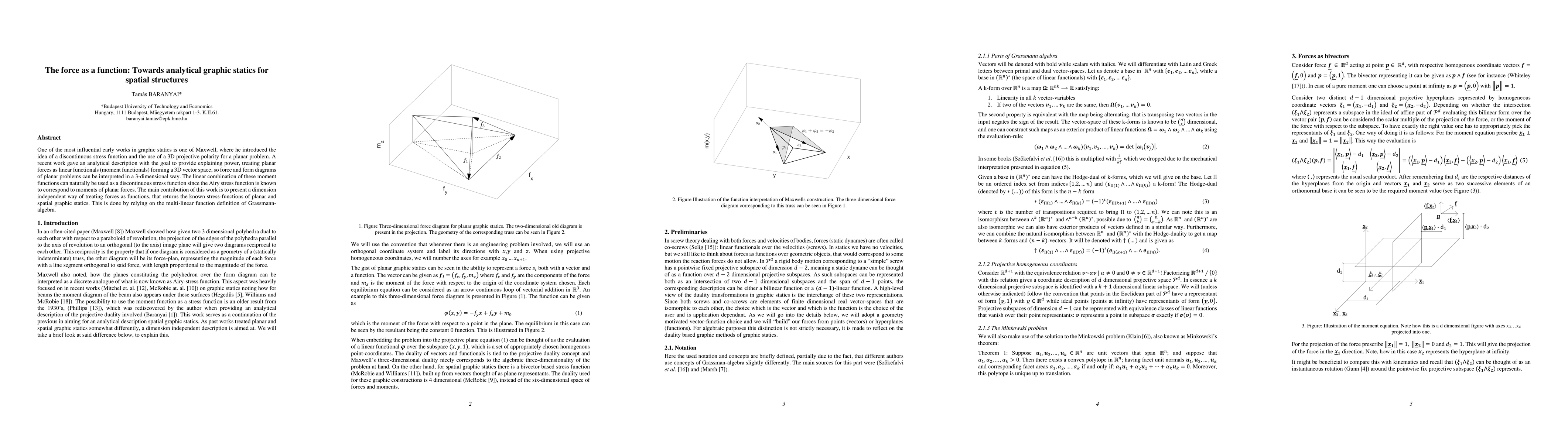 This paper proposes an analytical approach to graphic statics by treating planar forces as linear functionals forming a 3D vector space, utilizing multi-linear functions from Grassmann-algebra to represent forces as functions. It aims to provide a dimension-independent method that recovers known stress-functions for both planar and spatial structures.