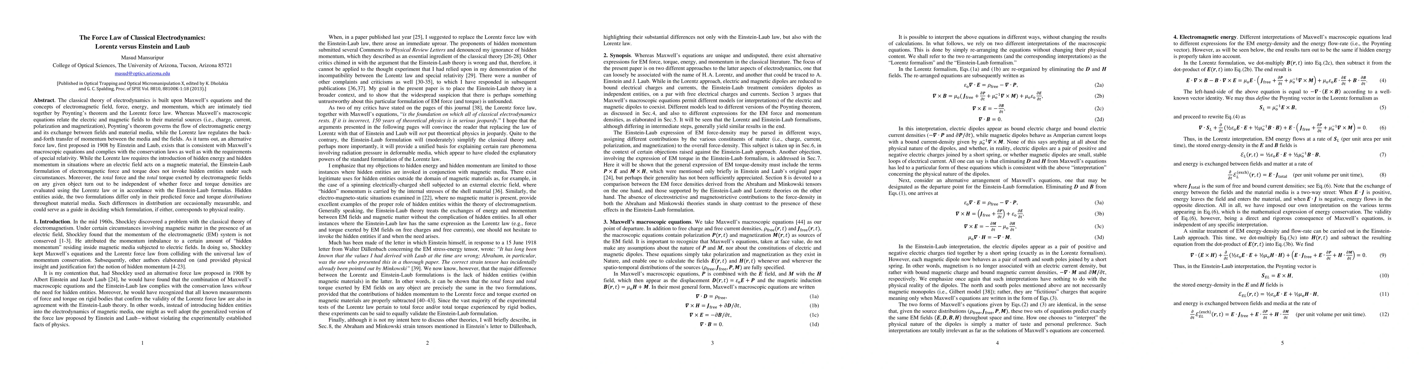 This paper explores the classical electrodynamics force laws, comparing the traditional Lorentz force law with an alternative formulation proposed by Einstein and Laub in 1908. While both are consistent with Maxwell's equations and conservation laws, the Einstein-Laub law avoids invoking hidden energy and momentum, potentially offering a more straightforward interpretation of electromagnetic interactions in materials.