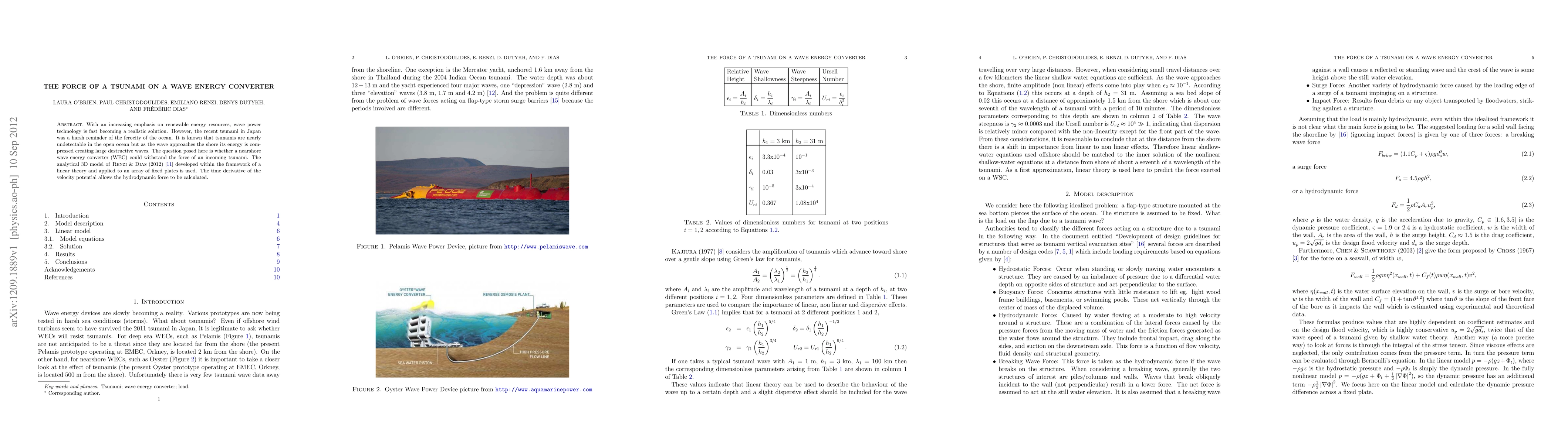 With an increasing emphasis on renewable energy resources, wave power technology is fast becoming a realistic solution. However, the recent tsunami in Japan was a harsh reminder of the ferocity of the ocean. It is known that tsunamis are nearly undetectable in the open ocean but as the wave approaches the shore its energy is compressed creating large destructive waves. The question posed here is whether a nearshore wave energy converter (WEC) could withstand the force of an incoming tsunami. The analytical 3D model of Renzi & Dias (2012) developed within the framework of a linear theory and applied to an array of fixed plates is used. The time derivative of the velocity potential allows the hydrodynamic force to be calculated.
