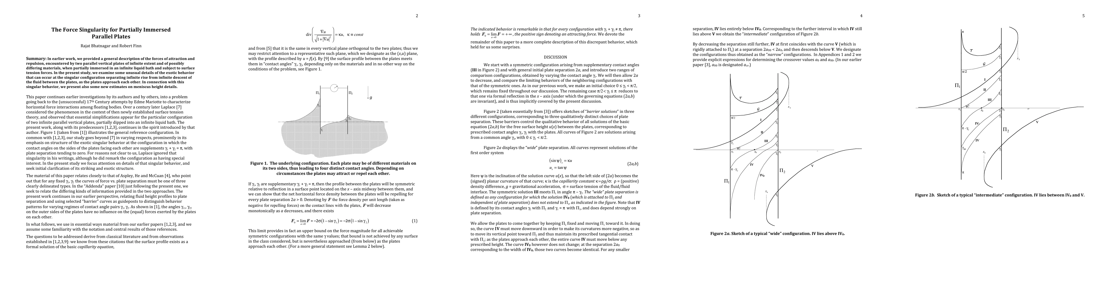 In earlier work, we provided a general description of the forces of attraction and repulsion, encountered by two parallel vertical plates of infinite extent and of possibly differing materials, when partially immersed in an infinite liquid bath and subject to surface tension forces. In the present study, we examine some unusual details of the exotic behavior that can occur at the singular configuration separating infinite rise from infinite descent of the fluid between the plates, as the plates approach each other. In connection with this singular behavior, we present also some new estimates on meniscus height details.