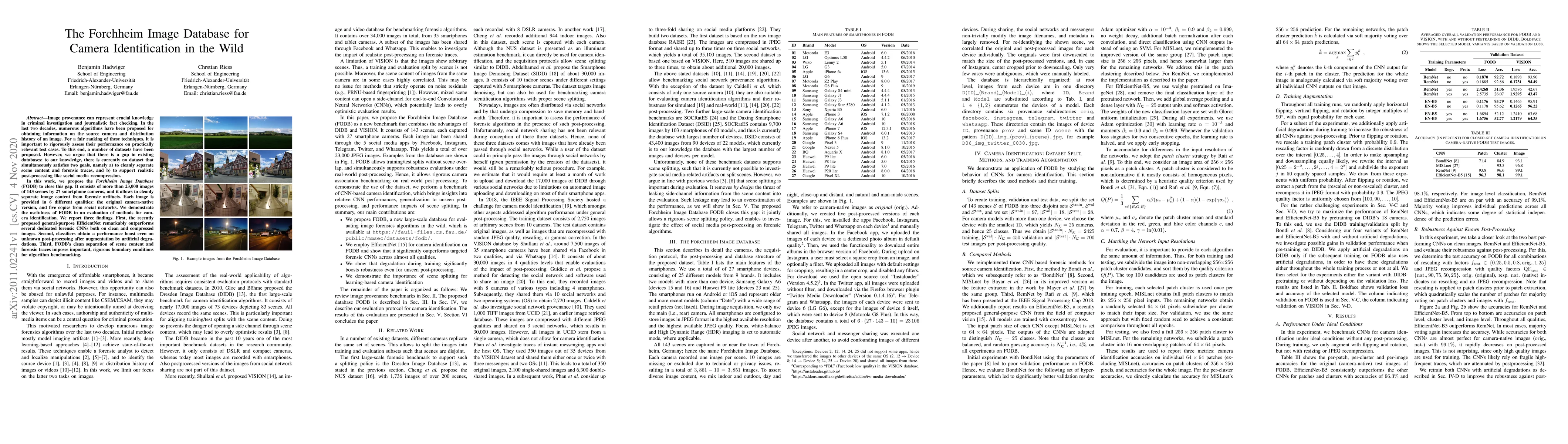 The Forchheim Image Database (FODB) is introduced to address gaps in existing datasets for camera identification. Comprising over 23,000 images from 27 smartphone cameras, FODB separates scene content from forensic traces and offers images in various qualities. Evaluations reveal that EfficientNet outperforms forensic CNNs, artificial degradations enhance classifier performance, and FODB's design imposes rigorous standards for algorithm benchmarking.