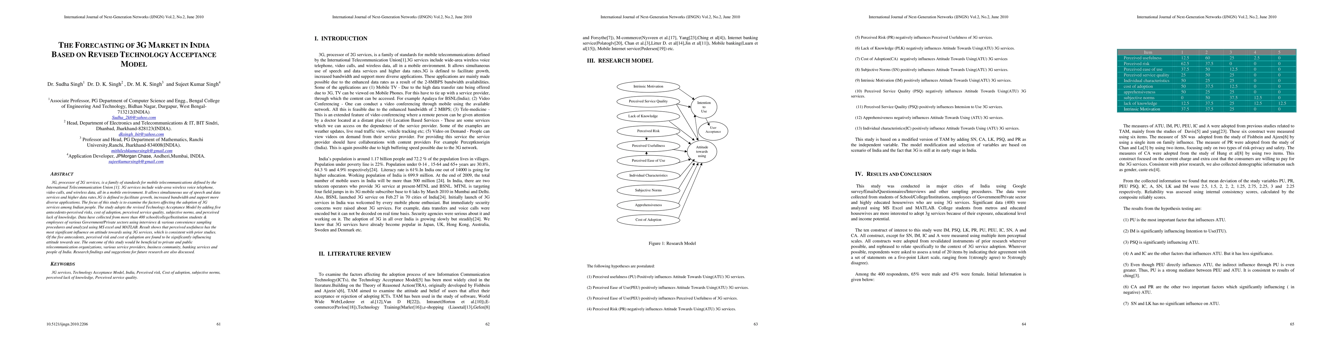 3G, processor of 2G services, is a family of standards for mobile telecommunications defined by the International Telecommunication Union [1]. 3G services include wide-area wireless voice telephone, video calls, and wireless data, all in a mobile environment. It allows simultaneous use of speech and data services and higher data rates.3G is defined to facilitate growth, increased bandwidth and support more diverse applications. The focus of this study is to examine the factors affecting the adoption of 3G services among Indian people. The study adopts the revised Technology Acceptance Model by adding five antecedents-perceived risks, cost of adoption, perceived service quality, subjective norms, and perceived lack of knowledge. Data have collected from more than 400 school/college/Institution students & employees of various Government/Private sectors using interviews & various convenience sampling procedures and analyzed using MS excel and MATLAB. Result shows that perceived usefulness has the most significant influence on attitude towards using 3G services, which is consistent with prior studies. Of the five antecedents, perceived risk and cost of adoption are found to be significantly influencing attitude towards use. The outcome of this study would be beneficial to private and public telecommunication organizations, various service providers, business community, banking services and people of India. Research findings and suggestions for future research are also discussed.