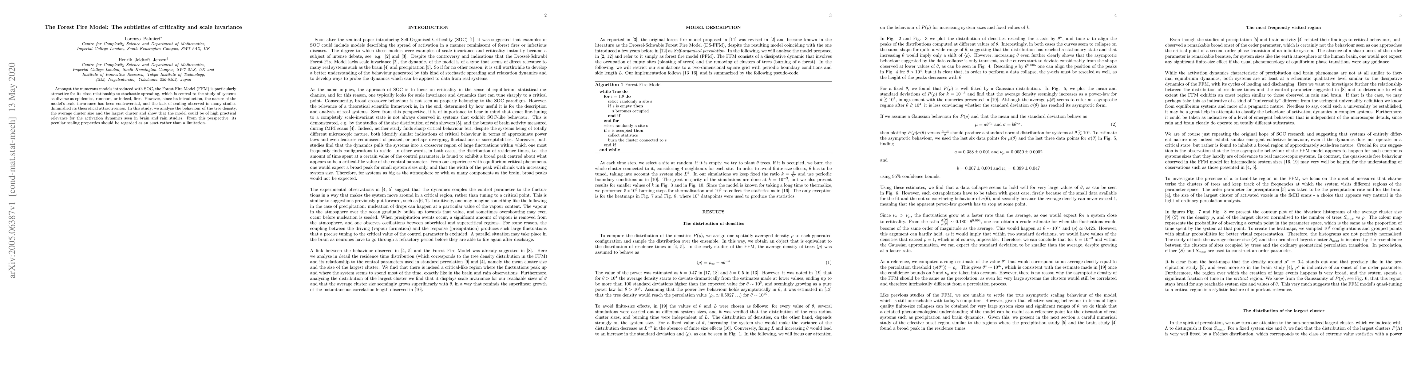 Amongst the numerous models introduced with SOC, the Forest Fire Model (FFM) is particularly attractive for its close relationship to stochastic spreading, which is central to the study of systems as diverse as epidemics, rumours, or indeed, fires. However, since its introduction, the nature of the model's scale invariance has been controversial, and the lack of scaling observed in many studies diminished its theoretical attractiveness. In this study, we analyse the behaviour of the tree density, the average cluster size and the largest cluster and show that the model could be of high practical relevance for the activation dynamics seen in brain and rain studies. From this perspective, its peculiar scaling properties should be regarded as an asset rather than a limitation.