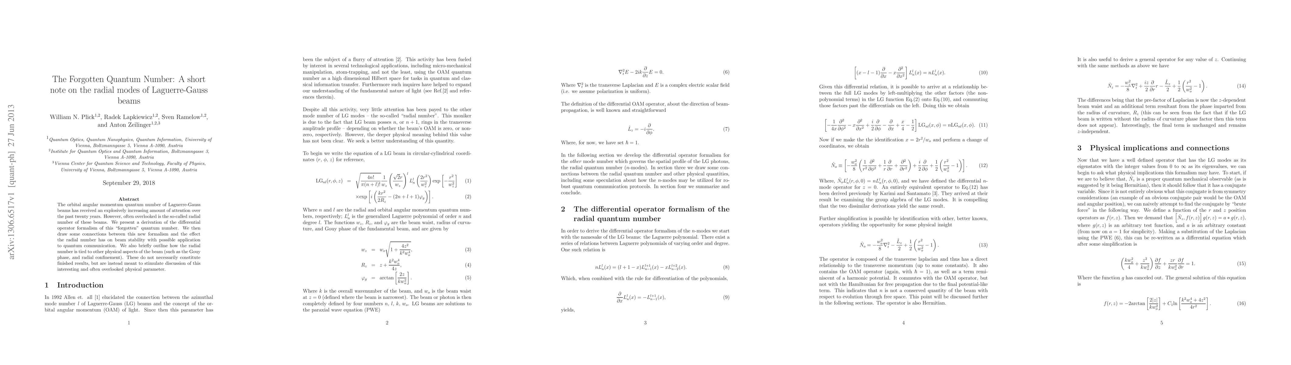 The orbital angular momentum quantum number of Laguerre-Gauss beams has received an explosively increasing amount of attention over the past twenty years. However, often overlooked is the so-called radial number of these beams. We present a derivation of the differential operator formalism of this "forgotten" quantum number. We then draw some connections between this new formalism and the effect the radial number has on beam stability with possible application to quantum communication. We also briefly outline how the radial number is tied to other physical aspects of the beam (such as the Gouy phase, and radial confinement). These do not necessarily constitute finished results, but are instead meant to stimulate discussion of this interesting and often overlooked physical parameter.