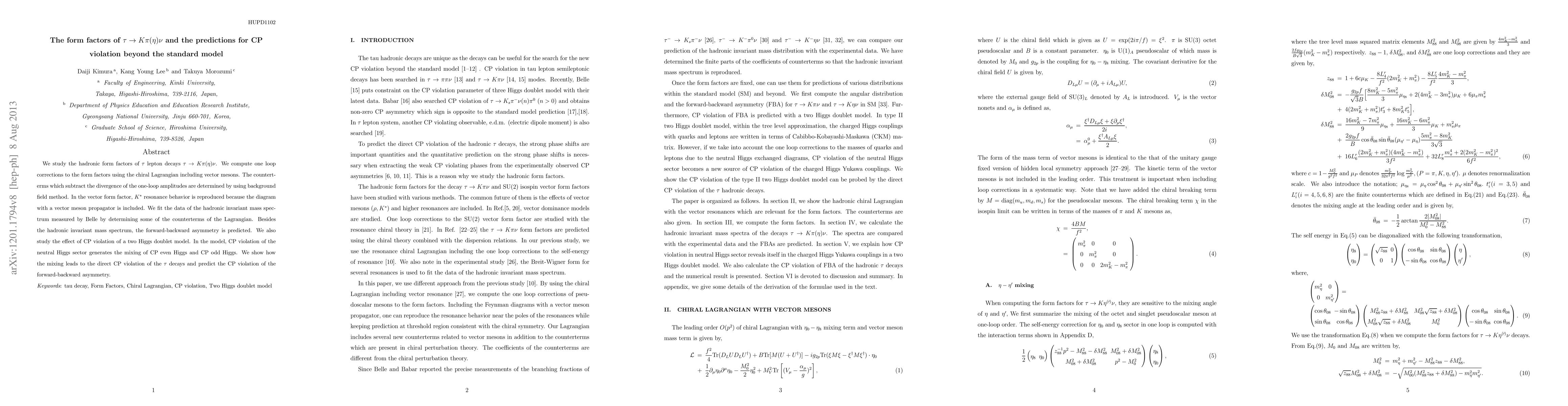 We study the hadronic form factors of $\tau$ lepton decays $\tau \to K \pi(\eta) \nu$. We compute one loop corrections to the form factors using the chiral Lagrangian including vector mesons. The counterterms which subtract the divergence of the one-loop amplitudes are determined by using background field method. In the vector form factor, $K^\ast$ resonance behavior is reproduced because the diagram with a vector meson propagator is included. We fit the data of the hadronic invariant mass spectrum measured by Belle by determining some of the counterterms of the Lagrangian. Besides the hadronic invariant mass spectrum, the forward-backward asymmetry is predicted. We also study the effect of CP violation of a two Higgs doublet model. In the model, CP violation of the neutral Higgs sector generates the mixing of CP even Higgs and CP odd Higgs. We show how the mixing leads to the direct CP violation of the $\tau$ decays and predict the CP violation of the forward-backward asymmetry.