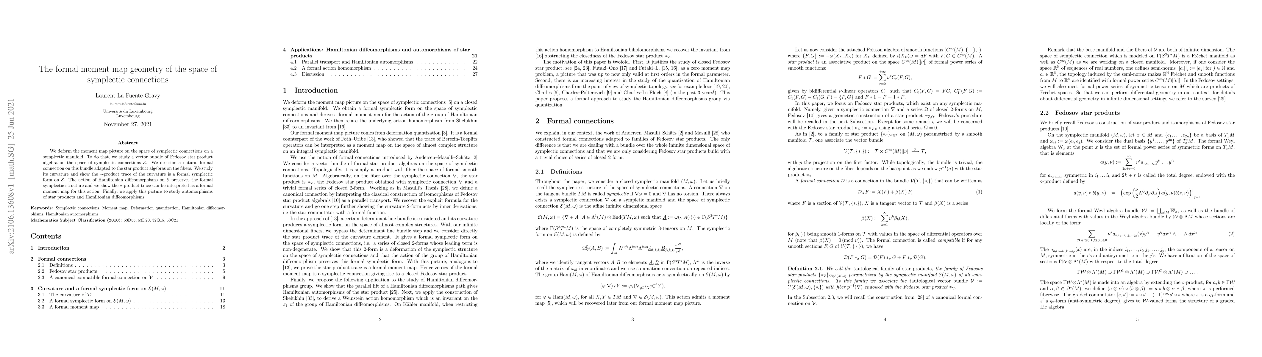 This paper develops a formal moment map for the space of symplectic connections on a symplectic manifold by introducing a vector bundle of Fedosov star product algebras and studying its curvature, demonstrating that the star product trace of the curvature serves as a formal symplectic form and a formal moment map for Hamiltonian diffeomorphisms. The study extends to the implications for automorphisms of star products and Hamiltonian diffeomorphisms, showing how the formal symplectic structure is preserved under the action of Hamiltonian diffeomorphisms.