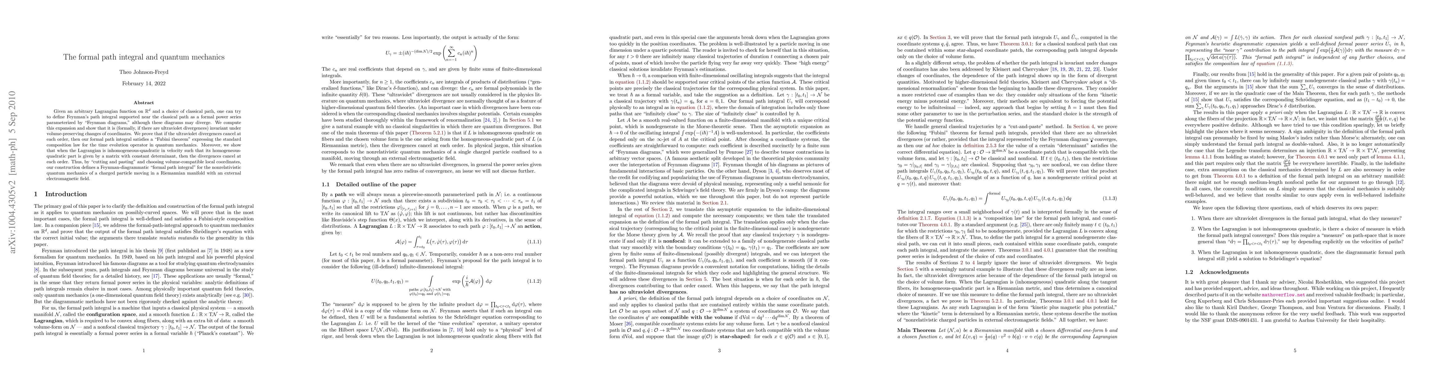 This paper constructs a formal path integral for quantum mechanics near classical paths, demonstrating its invariance under volume-preserving coordinate changes. It proves that when ultraviolet divergences cancel, the path integral satisfies a Fubini theorem, and it shows that for specific Lagrangians, these divergences indeed cancel, enabling a well-defined formal path integral for quantum mechanics in electromagnetic fields.