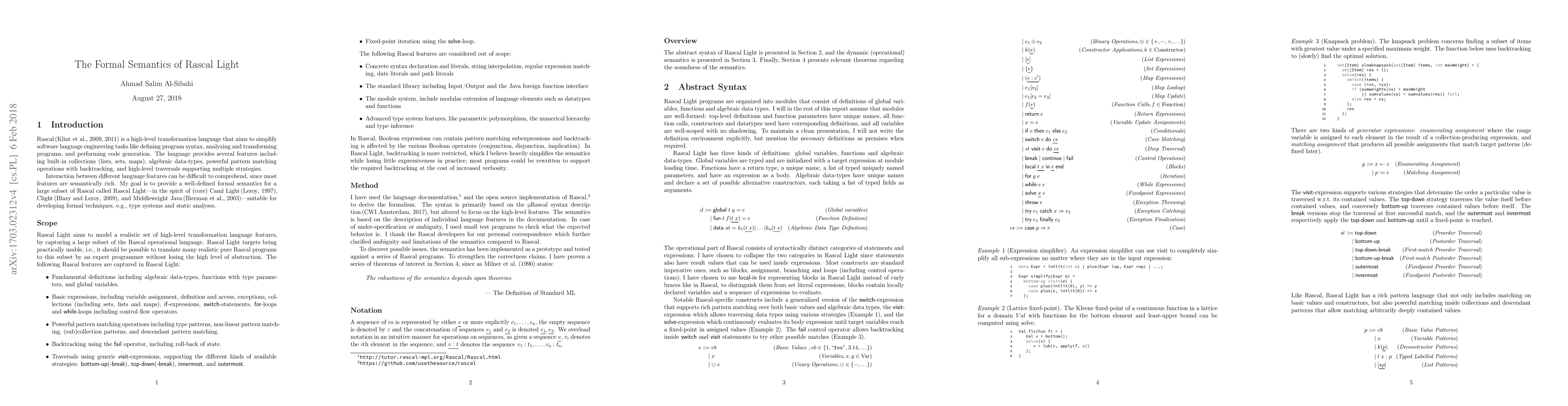 Rascal is a high-level transformation language that aims to simplify software language engineering tasks like defining program syntax, analyzing and transforming programs, and performing code generation. The language provides several features including built-in collections (lists, sets, maps), algebraic data-types, powerful pattern matching operations with backtracking, and high-level traversals supporting multiple strategies. Interaction between different language features can be difficult to comprehend, since most features are semantically rich. The report provides a well-defined formal semantics for a large subset of Rascal, called Rascal Light, suitable for developing formal techniques, e.g., type systems and static analyses. Additionally, the report states and proofs a series of interesting properties of the semantics, including purity of backtracking, strong typing, partial progress and the existence of a terminating subset.