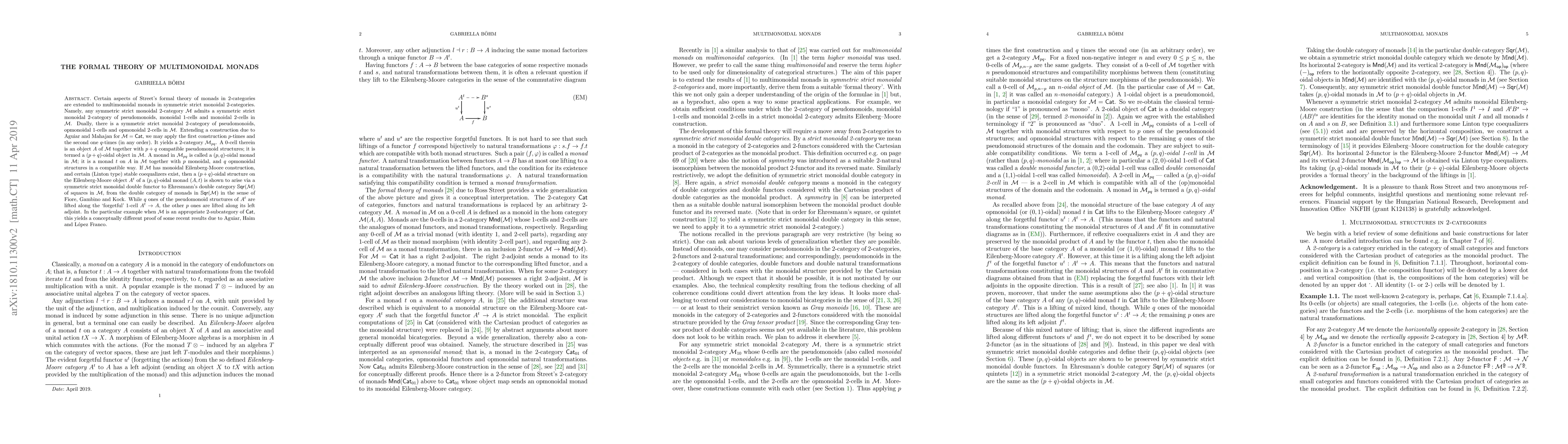 Certain aspects of Street's formal theory of monads in 2-categories are extended to multimonoidal monads in symmetric strict monoidal 2-categories. Namely, any symmetric strict monoidal 2-category $\mathcal M$ admits a symmetric strict monoidal 2-category of pseudomonoids, monoidal 1-cells and monoidal 2-cells in $\mathcal M$. Dually, there is a symmetric strict monoidal 2-category of pseudomonoids, opmonoidal 1-cells and opmonoidal 2-cells in $\mathcal M$. Extending a construction due to Aguiar and Mahajan for $\mathcal M=\mathsf{Cat}$, we may apply the first construction $p$-times and the second one $q$-times (in any order). It yields a 2-category $\mathcal M_{pq}$. A 0-cell therein is an object $A$ of $\mathcal M$ together with $p+q$ compatible pseudomonoid structures; it is termed a $(p+q)$-oidal object in $\mathcal M$. A monad in $\mathcal M_{pq}$ is called a $(p,q)$-oidal monad in $\mathcal M$; it is a monad $t$ on $A$ in $\mathcal M$ together with $p$ monoidal, and $q$ opmonoidal structures in a compatible way. If $\mathcal M$ has monoidal Eilenberg-Moore construction, and certain (Linton type) stable coequalizers exist, then a $(p+q)$-oidal structure on the Eilenberg-Moore object $A^t$ of a $(p,q)$-oidal monad $(A,t)$ is shown to arise via a symmetric strict monoidal double functor to Ehresmann's double category $\mathbb S\mathsf{qr} (\mathcal M)$ of squares in $\mathcal M$, from the double category of monads in $\mathbb S\mathsf{qr} (\mathcal M)$ in the sense of Fiore, Gambino and Kock. While $q$ ones of the pseudomonoid structures of $A^t$ are lifted along the `forgetful' 1-cell $A^t \to A$, the other $p$ ones are lifted along its left adjoint. In the particular example when $\mathcal M$ is an appropriate 2-subcategory of $\mathsf{Cat}$, this yields a conceptually different proof of some recent results due to Aguiar, Haim and L\'opez Franco.