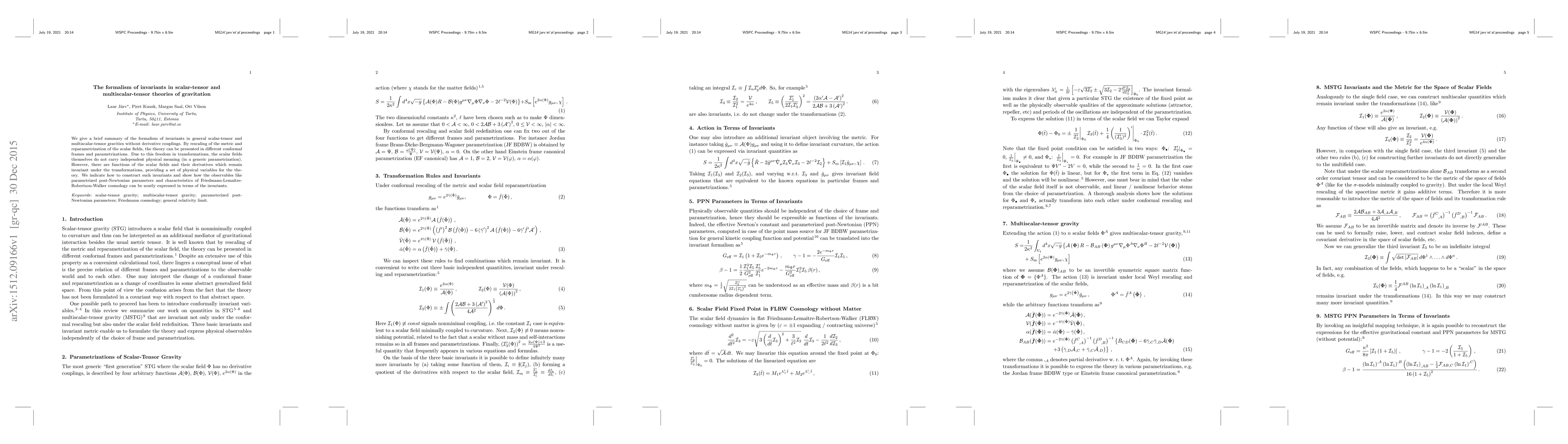 We give a brief summary of the formalism of invariants in general scalar-tensor and multiscalar-tensor gravities without derivative couplings. By rescaling of the metric and reparametrization of the scalar fields, the theory can be presented in different conformal frames and parametrizations. Due to this freedom in transformations, the scalar fields themselves do not carry independent physical meaning (in a generic parametrization). However, there are functions of the scalar fields and their derivatives which remain invariant under the transformations, providing a set of physical variables for the theory. We indicate how to construct such invariants and show how the observables like parametrized post-Newtonian parameters and characteristics of Friedmann-Lemaitre-Robertson-Walker cosmology can be neatly expressed in terms of the invariants.