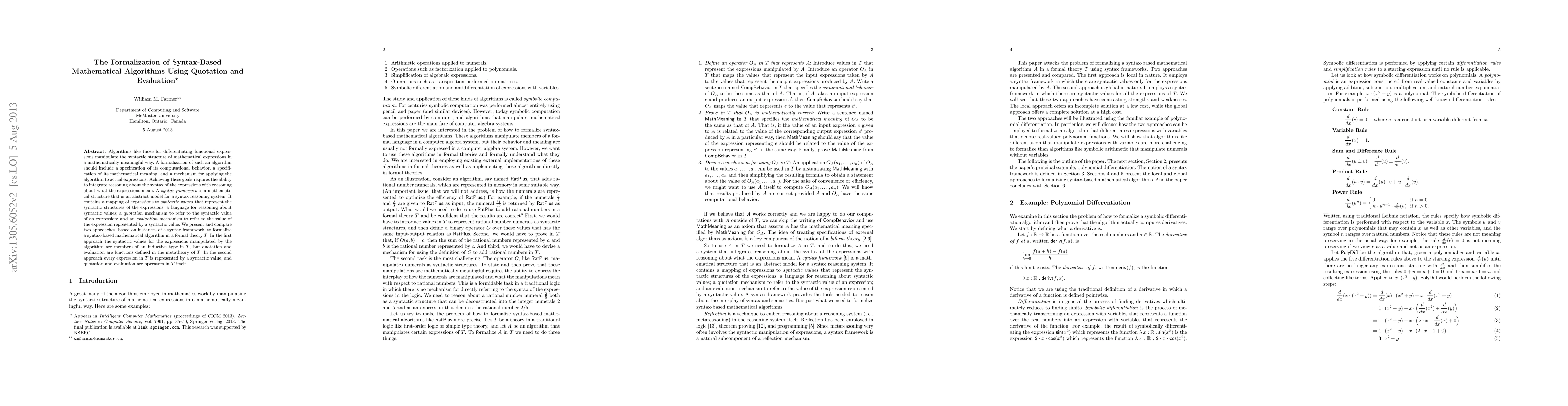 This paper presents two approaches for formalizing syntax-based mathematical algorithms using quotation and evaluation. The first approach uses an inductive type for syntactic values in formal theory T, while quotation and evaluation are defined in the metatheory. The second approach embeds syntactic values and operators for quotation and evaluation directly within T.