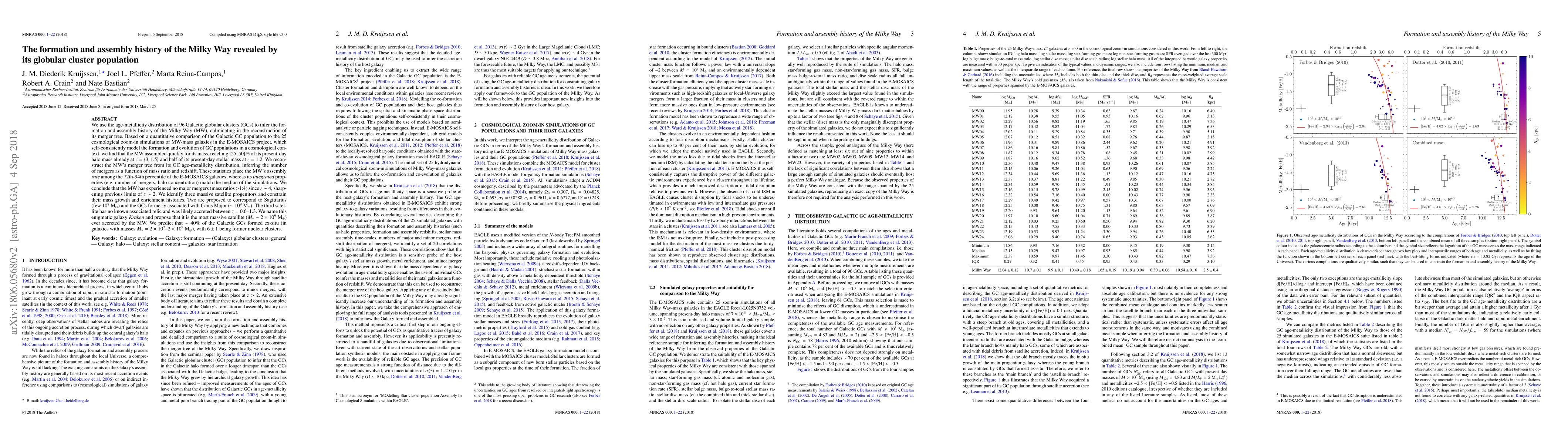 We use the age-metallicity distribution of 96 Galactic globular clusters (GCs) to infer the formation and assembly history of the Milky Way (MW), culminating in the reconstruction of its merger tree. Based on a quantitative comparison of the Galactic GC population to the 25 cosmological zoom-in simulations of MW-mass galaxies in the E-MOSAICS project, which self-consistently model the formation and evolution of GC populations in a cosmological context, we find that the MW assembled quickly for its mass, reaching $\{25,50\}\%$ of its present-day halo mass already at $z=\{3,1.5\}$ and half of its present-day stellar mass at $z=1.2$. We reconstruct the MW's merger tree from its GC age-metallicity distribution, inferring the number of mergers as a function of mass ratio and redshift. These statistics place the MW's assembly $\textit{rate}$ among the 72th-94th percentile of the E-MOSAICS galaxies, whereas its $\textit{integrated}$ properties (e.g. number of mergers, halo concentration) match the median of the simulations. We conclude that the MW has experienced no major mergers (mass ratios $>$1:4) since $z\sim4$, sharpening previous limits of $z\sim2$. We identify three massive satellite progenitors and constrain their mass growth and enrichment histories. Two are proposed to correspond to Sagittarius (few $10^8~{\rm M}_\odot$) and the GCs formerly associated with Canis Major ($\sim10^9~{\rm M}_\odot$). The third satellite has no known associated relic and was likely accreted between $z=0.6$-$1.3$. We name this enigmatic galaxy $\textit{Kraken}$ and propose that it is the most massive satellite ($M_*\sim2\times10^9~{\rm M}_\odot$) ever accreted by the MW. We predict that $\sim40\%$ of the Galactic GCs formed ex-situ (in galaxies with masses $M_*=2\times10^7$-$2\times10^9~{\rm M}_\odot$), with $6\pm1$ being former nuclear clusters.
